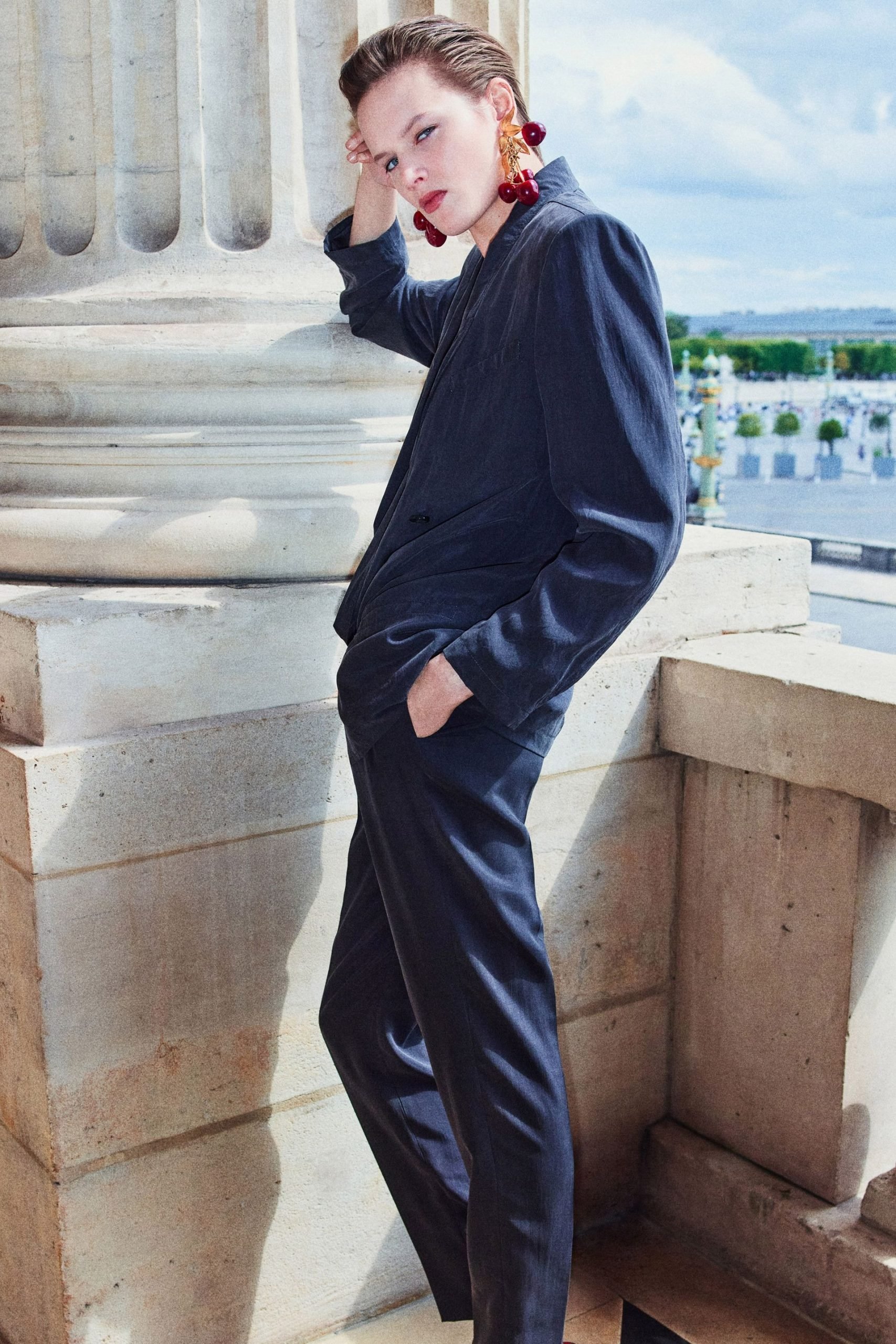Les codes emblématiques de Saint Laurent sont présents, mais abordés avec sobriété. Les blouses à nœud oversize font leur retour dans des tissus mats plutôt que dans la soie d’archives. Les longues robes en satin se déclinent en bleu marine et dans des tons métallisés, avec des fentes et des détails noués qui évoquent davantage les années 90 que les années 70.