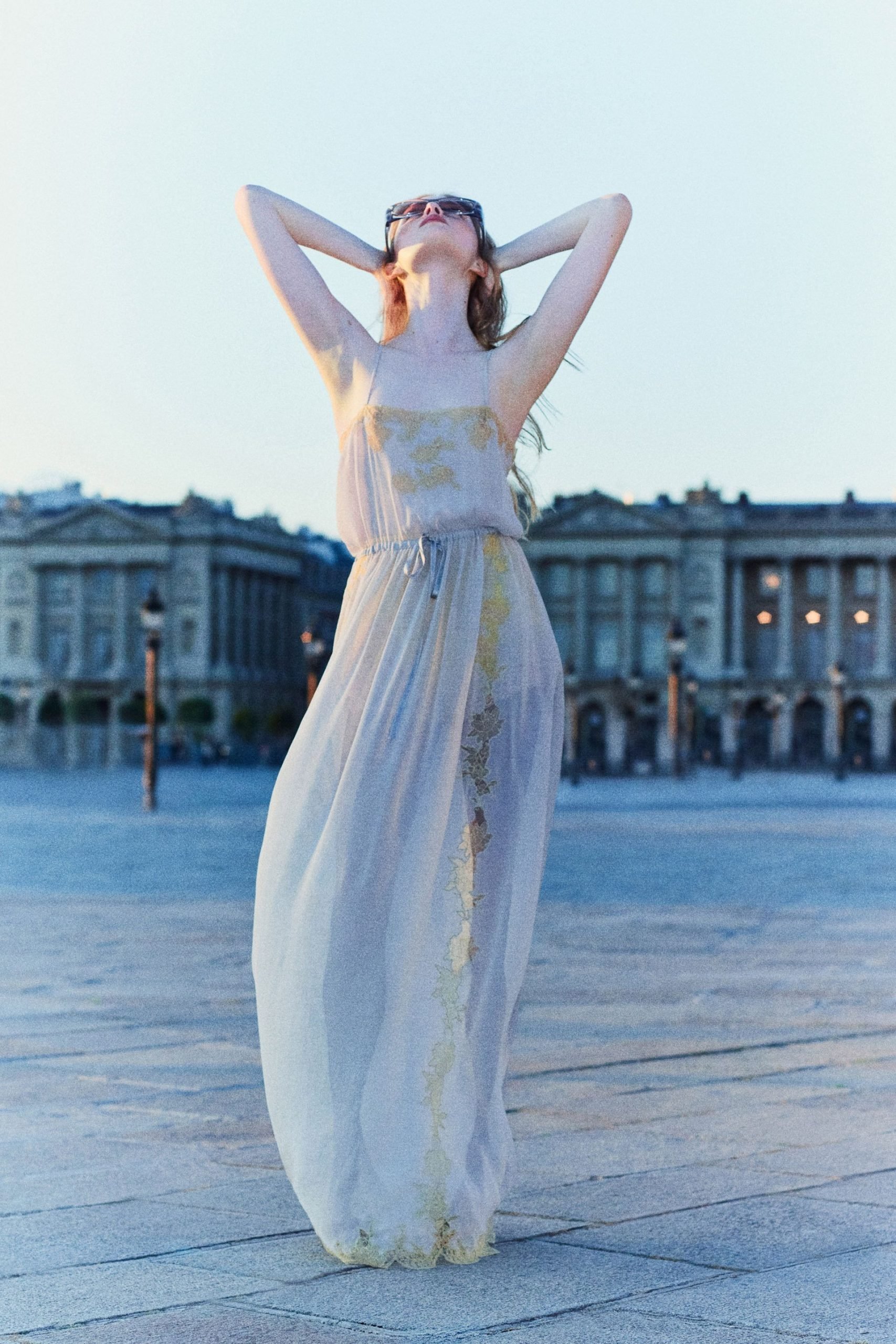 Parallèlement à ces silhouettes, Vaccarello intègre la lingerie à ses collections. Shorts bordés de dentelle, nuisettes asymétriques en satin et pièces en soie pâle rose, bleu roi et vert d’eau sont considérés comme faisant partie intégrante du vestiaire. Les maillots de bain sont associés à des talons et des bijoux, servant de base à des looks complets. De petits détails contribuent à l’harmonie de l’ensemble : boucles d’oreilles cerise, escarpins à talons hauts de couleur unie et jupes en vinyle brillant apparaissent tout au long de la collection, créant un rythme qui unifie les silhouettes sans recourir à une narration artificielle.