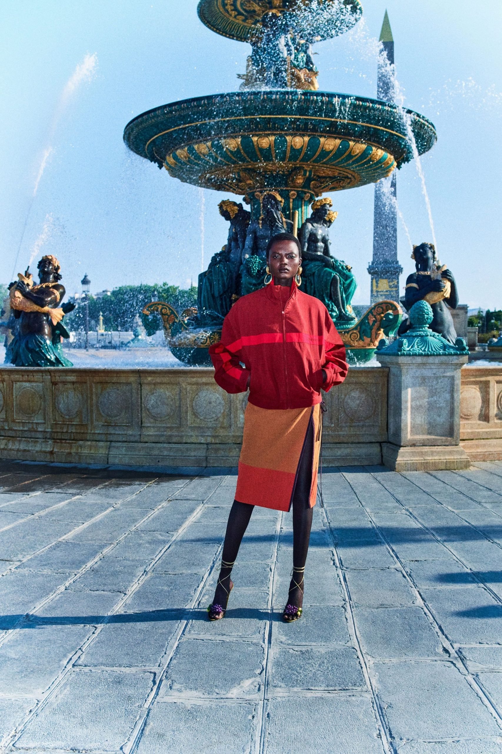 Les pièces sportswear sont confectionnées en nylon ultra-léger. Anoraks, cagoules et tops zippés présentent des épaules structurées et une taille cintrée. Elles se déclinent en color-blocks saturés : écarlate et vermillon, bleu canard et ivoire, ocre et vert foncé. Elles deviennent l’élément central du look, portées avec des escarpins, des collants opaques, des lunettes de soleil oversize ou associées à des shorts tailleur et des jupes laquées. L’effet est affirmé et dynamique, sans aucune référence aux logos ou au streetwear.