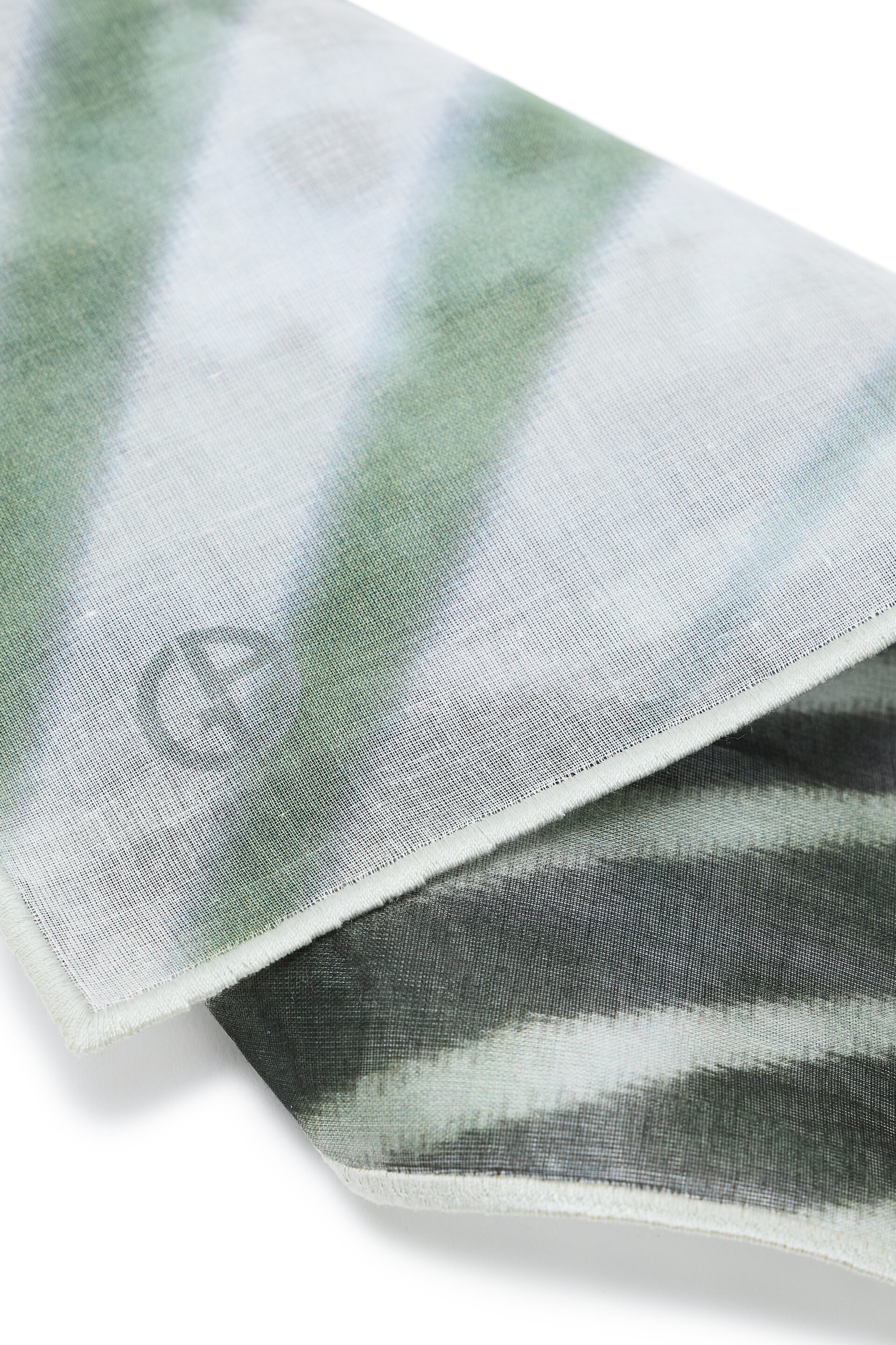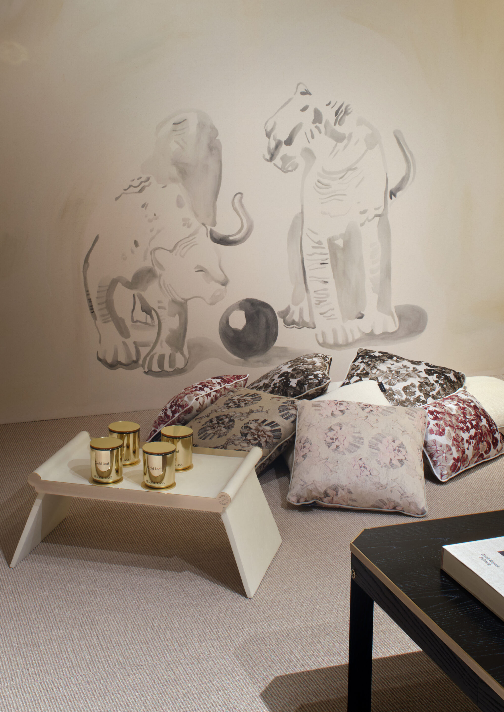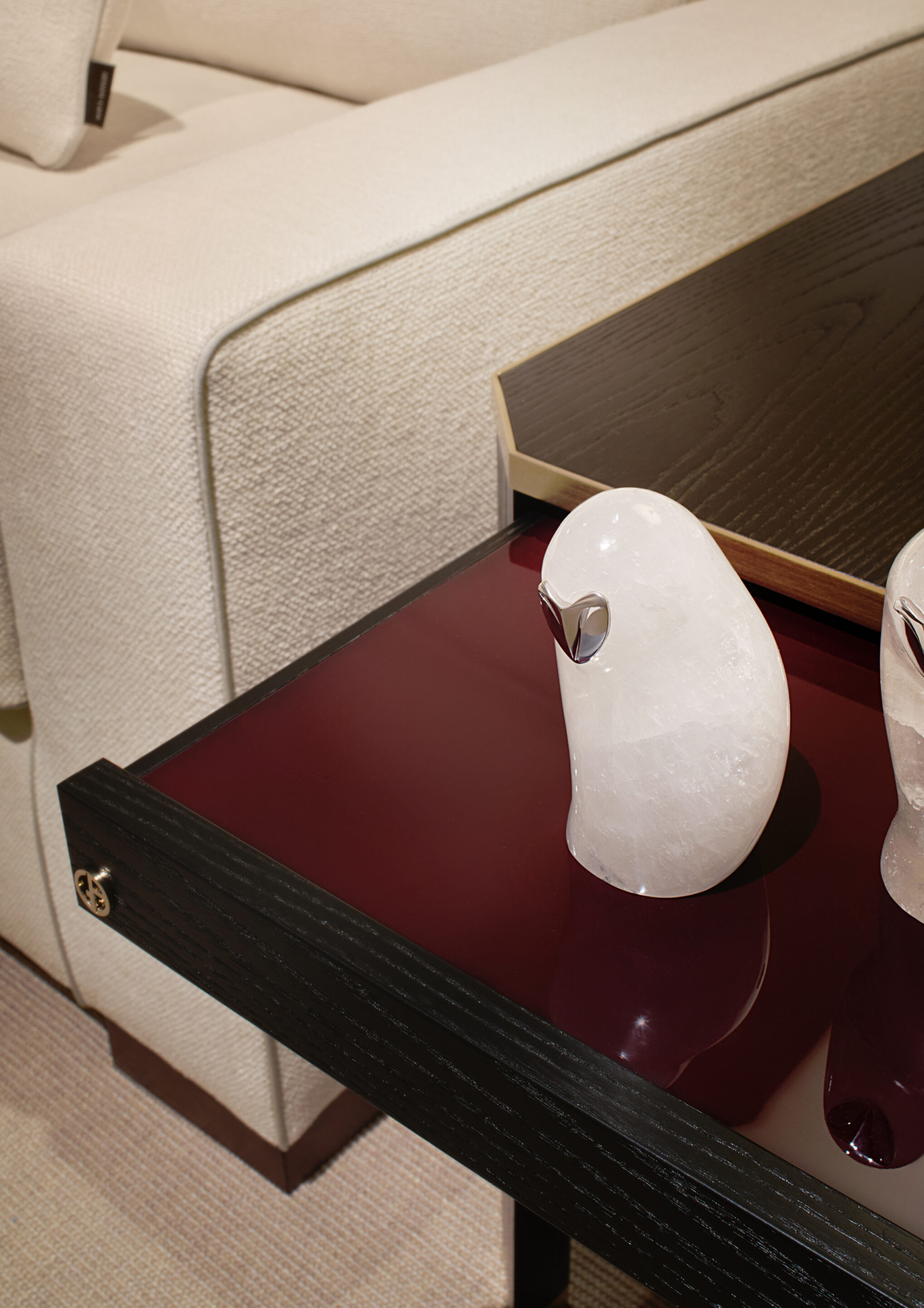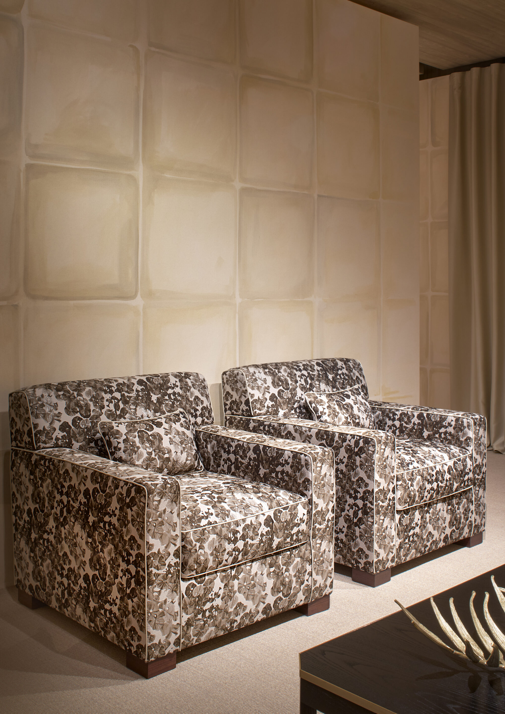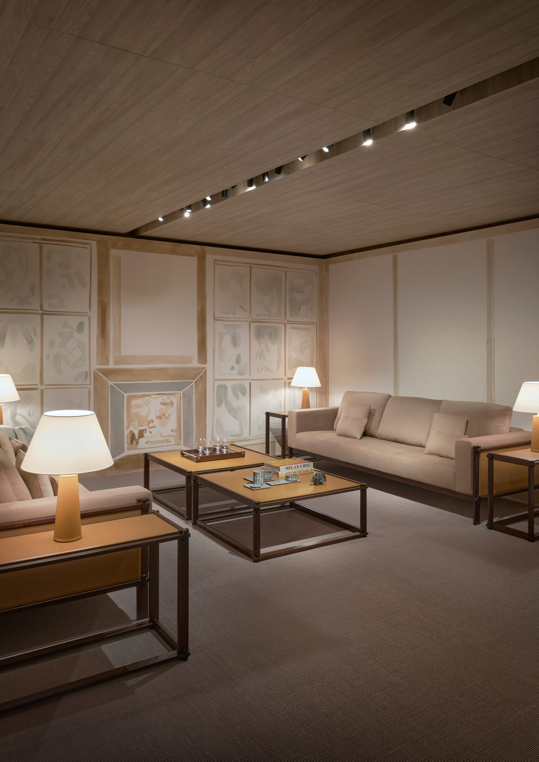 Une référence à l’escalier et aux panthères noires sculptées, l’un des coins les plus emblématiques de la maison milanaise de Giorgio Armani, caractérise la présentation du canapé habillé du précieux lin BILBAO à texture chenille délavée, des fauteuils ALBERT revêtus du jacquard floral BERLIN sur fond effet craquelé, des tables basses et tables d’appoint BRERA en frêne teinté noir avec bords métalliques dorés et petits plateaux extractibles contrastés, ainsi que des lampes LOGO. Couleurs, formes et textures s’harmonisent dans une expression d’équilibre parfait.