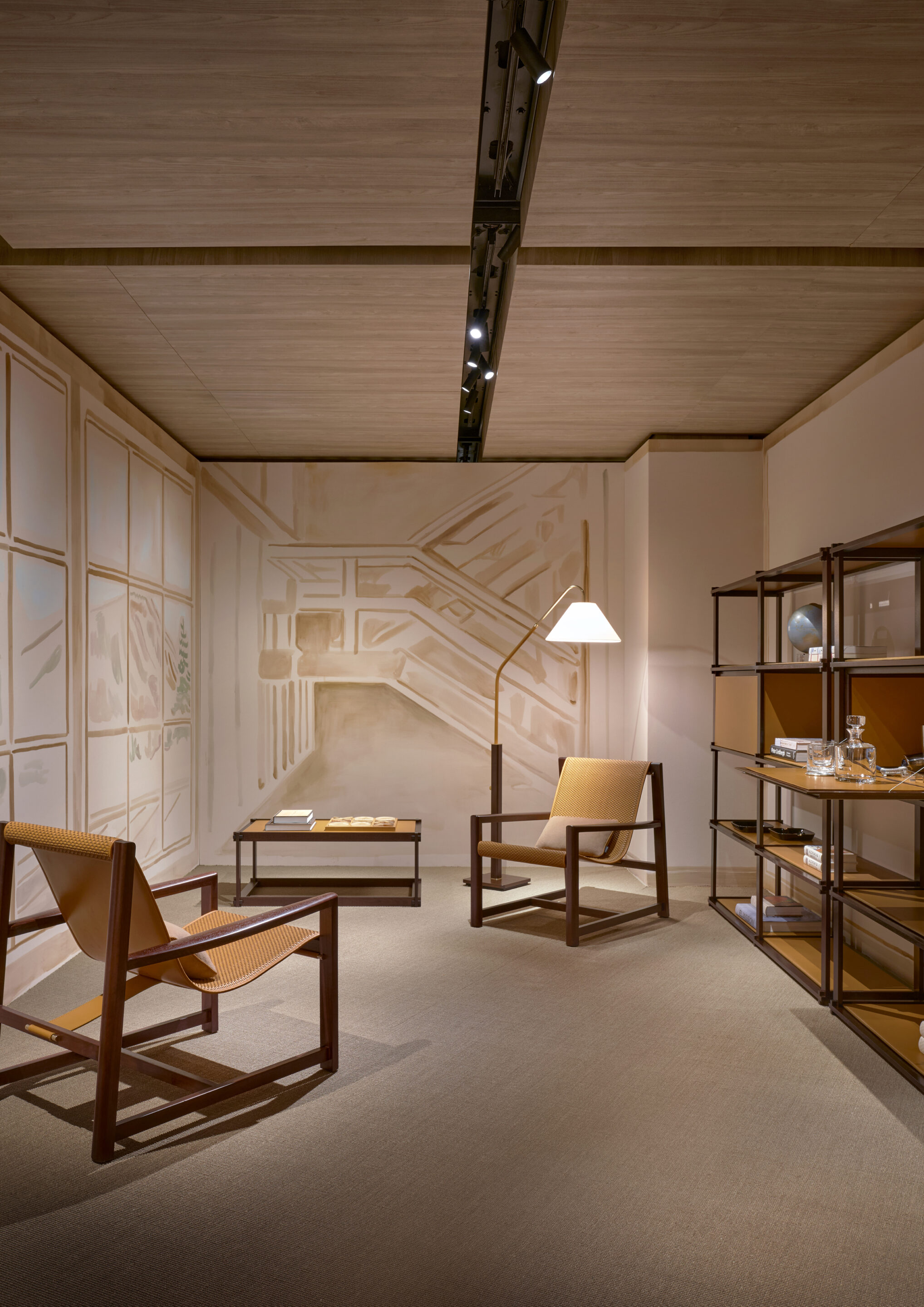 L’Icône est l’expression la plus pure de la vision Armani, condensée dans des objets reconnaissables et intemporels qui, tout en évoluant, conservent leur valeur intrinsèque. Les vitrines donnant sur la rue encadrent symboliquement huit pièces — le fauteuil BALOON, la console SEINE, le meuble bar RIESLING, la chaise de metteur en scène DUSTIN, le fauteuil TOKYO, le paravent WINCHESTER, la lampe LOGO et la table basse DANZICA — en plaçant l’original à côté de sa version la plus récente. La mise en scène joue sur les contrastes : d’un côté, l’objet dans sa forme initiale ; de l’autre, son « évolution », perceptible depuis l’extérieur seulement comme une silhouette filtrée à travers un verre dépoli, pleinement révélée à l’intérieur de la boutique. Au rez-de-chaussée, de grands rideaux en tissu noir recouvrent les murs et, tels des rideaux de théâtre, font briller les vitrines dorées.