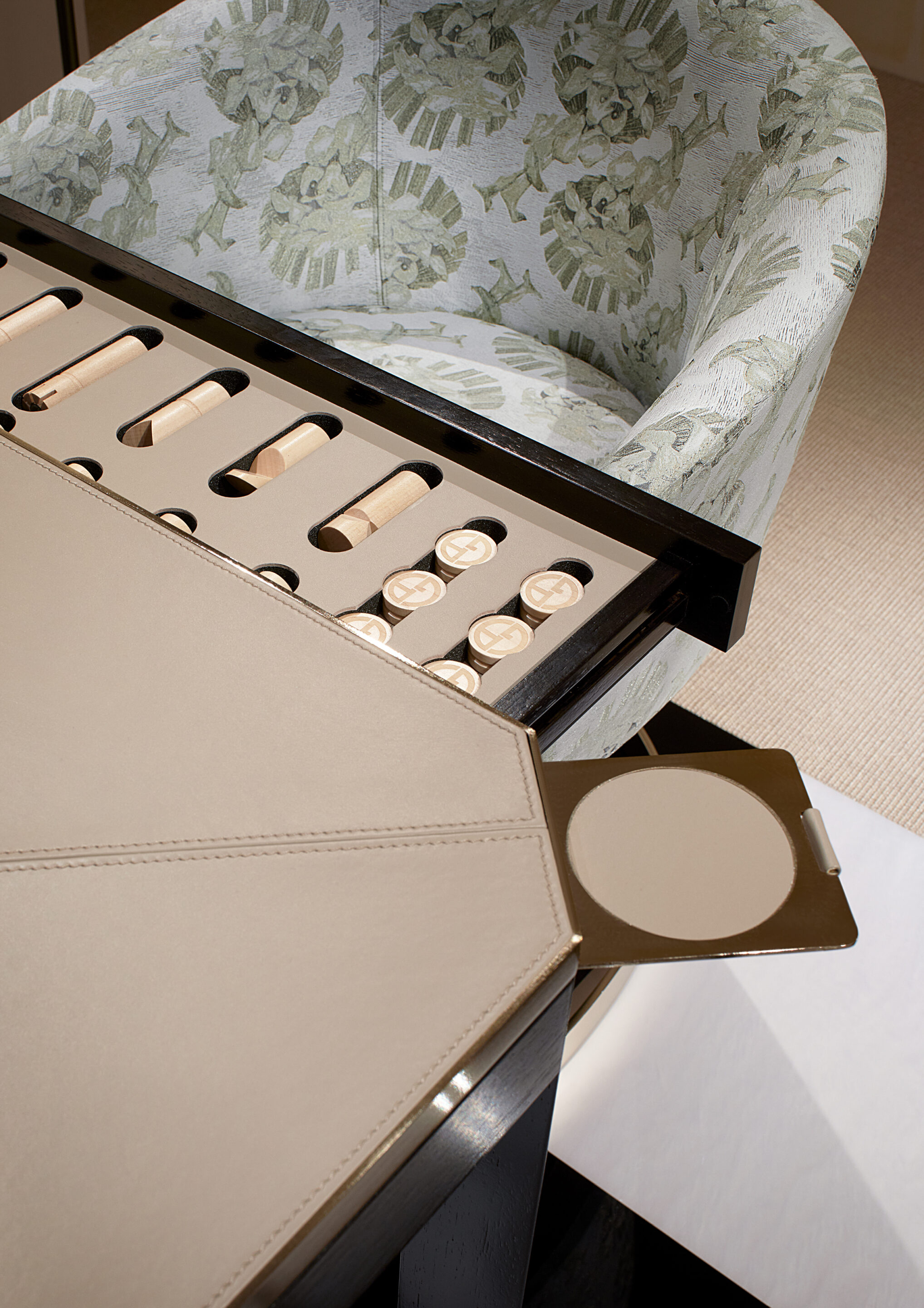 Au premier étage, l’espace invite à l’exploration et se conçoit comme une boussole silencieuse guidant le visiteur à travers trois univers entièrement dédiés au salon — cœur de la vie domestique — pensé pour l’hospitalité et les échanges, révélant la personnalité de ceux qui l’habitent. Chaque espace est défini par une grande aquarelle délicate peinte à la main évoquant des détails distinctifs des résidences de Giorgio Armani. La peinture représentant le mur galerie de la résidence milanaise — où émerge le langage intemporel du designer — sert de décor à la nouvelle table de jeu BORGONUOVO, aux chaises rembourrées CLASSIC habillées du délicat jacquard BRIGHTON inspiré des compositions Armani/Fiori, ainsi qu’à la lampe LOGO dans sa nouvelle version sur pied. La douceur des couleurs contraste avec le sol en damier noir et blanc, en dialogue avec le design de la table de jeu.