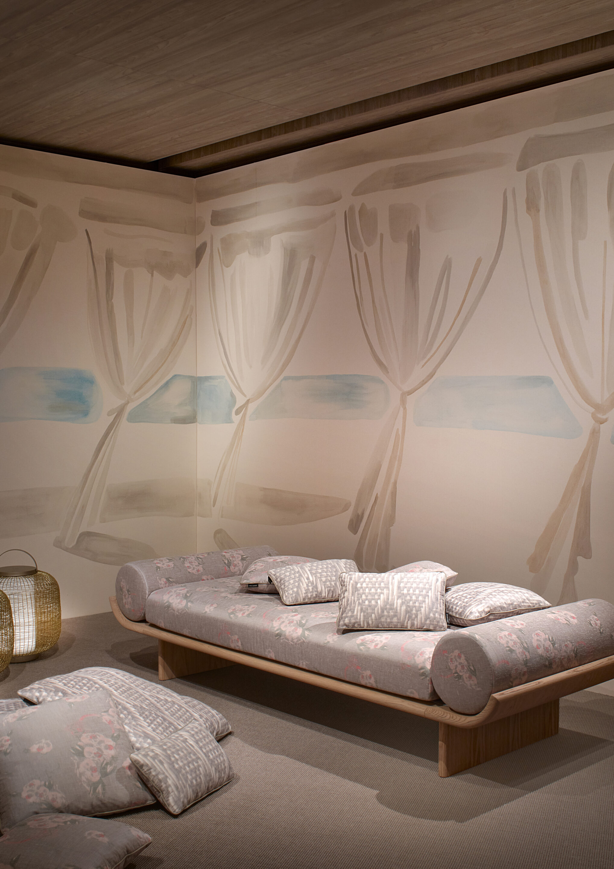 Le dernier espace est dédié aux moments de vacances partagés avec ses proches. Une représentation peinte d’un paysage marin paisible, avec de légers rideaux animés par la brise, évoque Pantelleria et sert de toile de fond au grand canapé modulaire BRANDO, composé d’une seule structure en chêne gris clair sablé supportant des coussins en soie shantung BOMBAI. L’ensemble est complété par les tables basses courbes BRANDO et les lampes de table RETTA.
