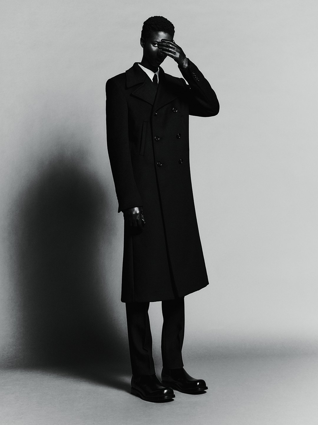 Pour les hommes, la collection propose un raffinement et une structuration du vestiaire masculin. L’identité sportswear contemporaine de Balenciaga fusionne ici avec le savoir-faire tailleur classique, s’inspirant de pièces créées par Cristóbal Balenciaga pour lui-même. Ces pièces se présentent sous forme d’hybrides dichotomiques, révélateurs d’une nouvelle intention : capes en cachemire, manteaux en néo-gazar, mêlant le formel au décontracté et sublimant le quotidien.