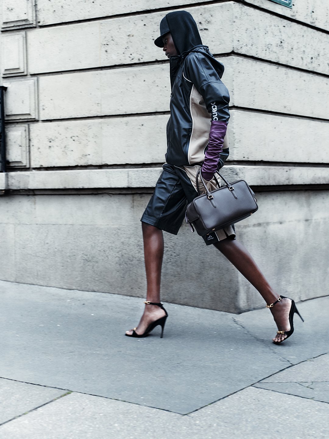 La femme Balenciaga continue de se redéfinir, mais son essence demeure : audace, intransigeance, force. Des touches d’élégance réinventent notre tenue de tous les jours : gants d’opéra, chapeaux à capuche, escarpins délicats. Des silhouettes emblématiques sont réinterprétées en cuir ou en molleton, insufflant une sophistication intemporelle à la mode masculine et féminine. Les vêtements investissent des univers vestimentaires distincts et variés : tailleurs de jour, ensembles de soirée, silhouettes inspirées du streetwear et TechWear, une nouvelle catégorie de sportswear signée Balenciaga, façonnée à la fois par l’héritage d’innovation de la maison et son identité contemporaine. Le tissu ProBody, grâce à ses propriétés techniques innovantes (évacuation de l’humidité, respirabilité, propriétés antibactériennes), se décline en formes dynamiques. Une collaboration avec la NBA met en lumière la place centrale du sport, la notion d’activité et de mouvement, ainsi que l’énergie dynamique et l’esprit collectif propres au basketball.