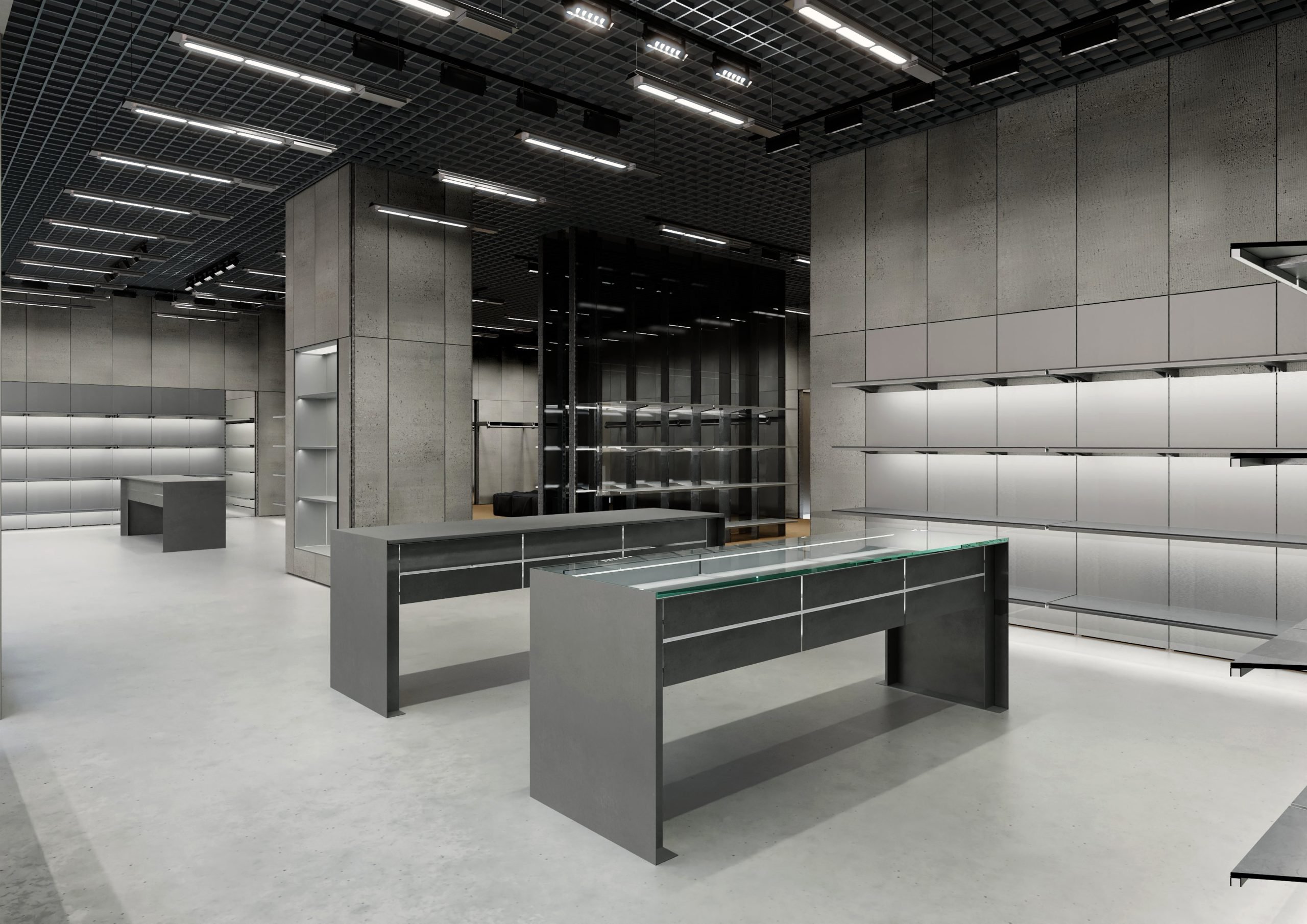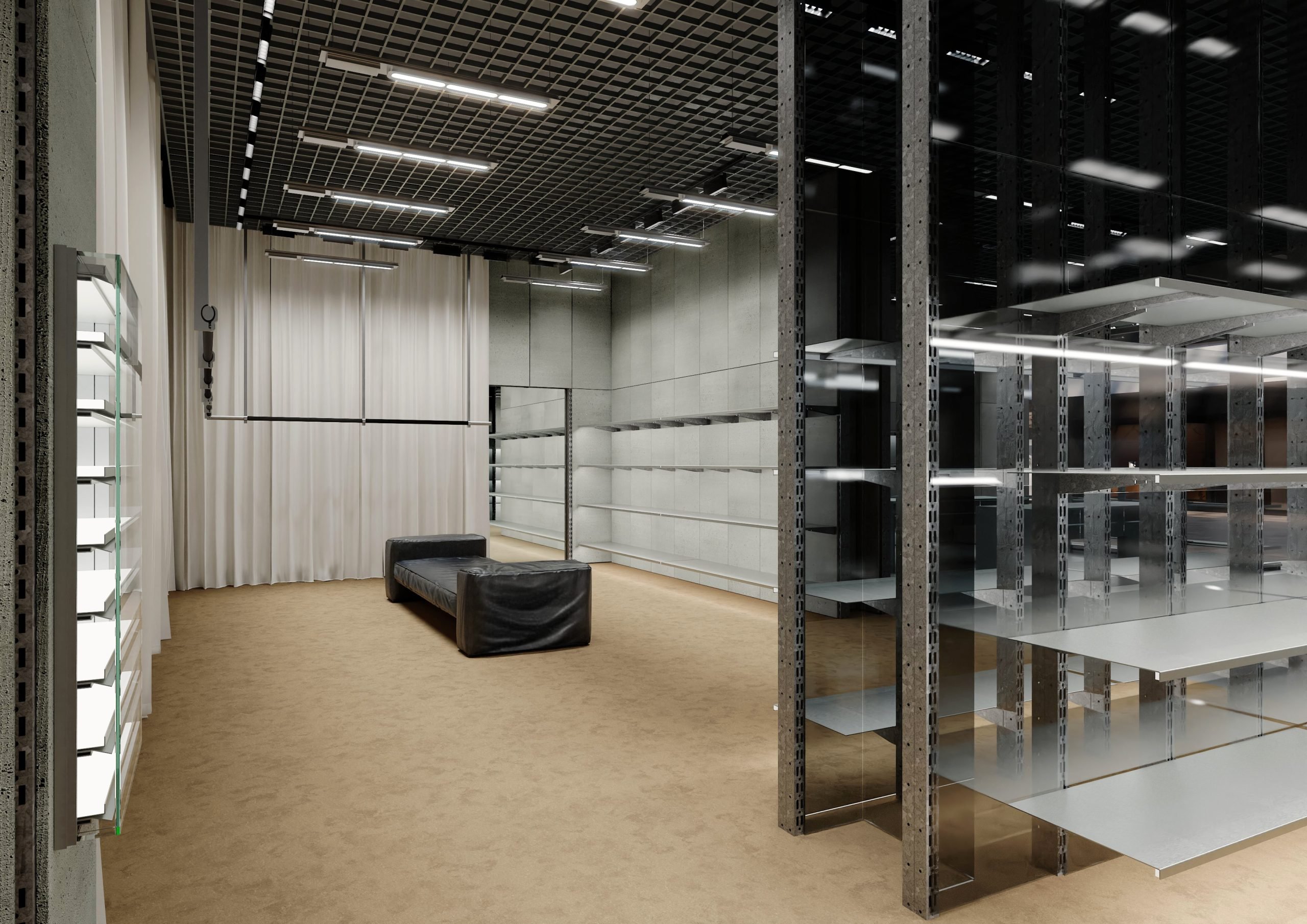 À l’intérieur, un jeu de textures tactile définit l’espace. Les sols en béton coulé, les cloisons en verre fumé et les portants en acier sont contrastés par une moquette beige texturée, des sièges en cuir moelleux et des rideaux écrus drapés. Les tables en métal brut et les étagères en aluminium extrudé rappellent les structures utilitaires des entrepôts, tandis que les grilles de plafond et les systèmes d’éclairage restent délibérément exposés au-dessus, conférant à l’espace une qualité esthétique.
