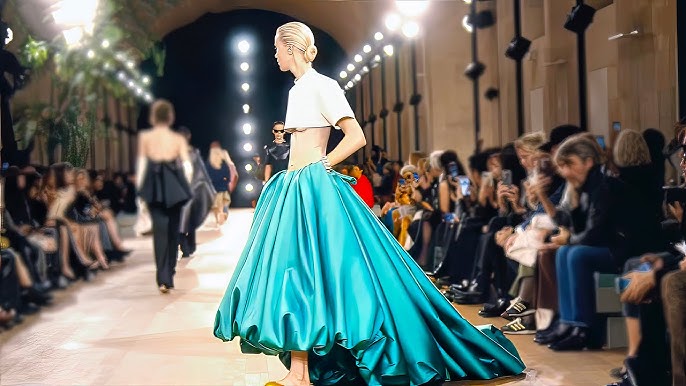 Puis, d’autres pièces sont ouvertes, libres, découpées pour révéler le corps, ou des fragments de robes posés contre la peau. Le mouvement semble fracturer les morceaux – des chorégraphies de franges créent des silhouettes qui se brisent et se reforment.