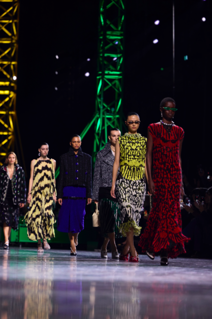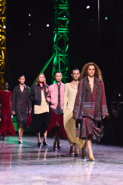Une iridescence satinée, ondulante et fluide s’empare de la collection à mesure que la nuit gagne du terrain sur le jour. Le papillon de nuit fait son apparition. Des robes et manteaux évanescents aux coupes épurées et souples, raccourcis ou tombant jusqu’au sol, sobres ou richement ornés, rythment des silhouettes en mouvement. Les femmes s’élancent dans la nuit.