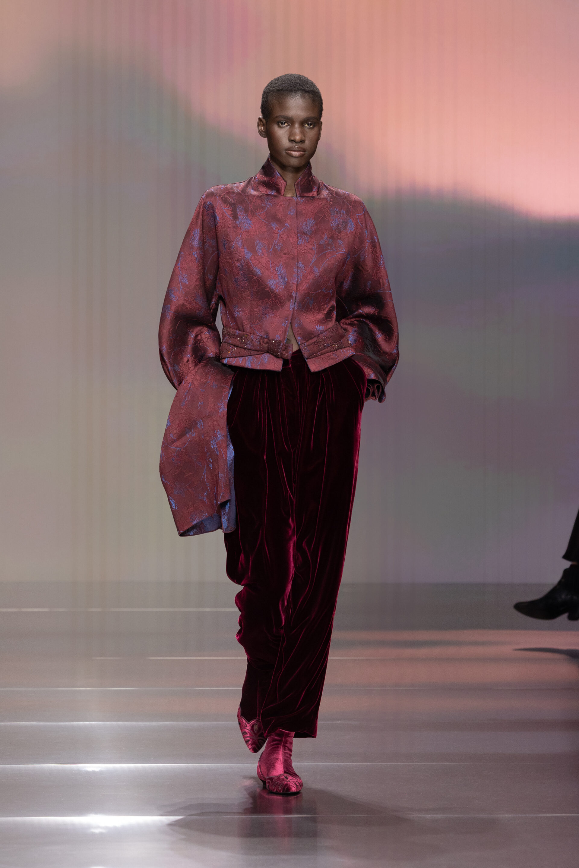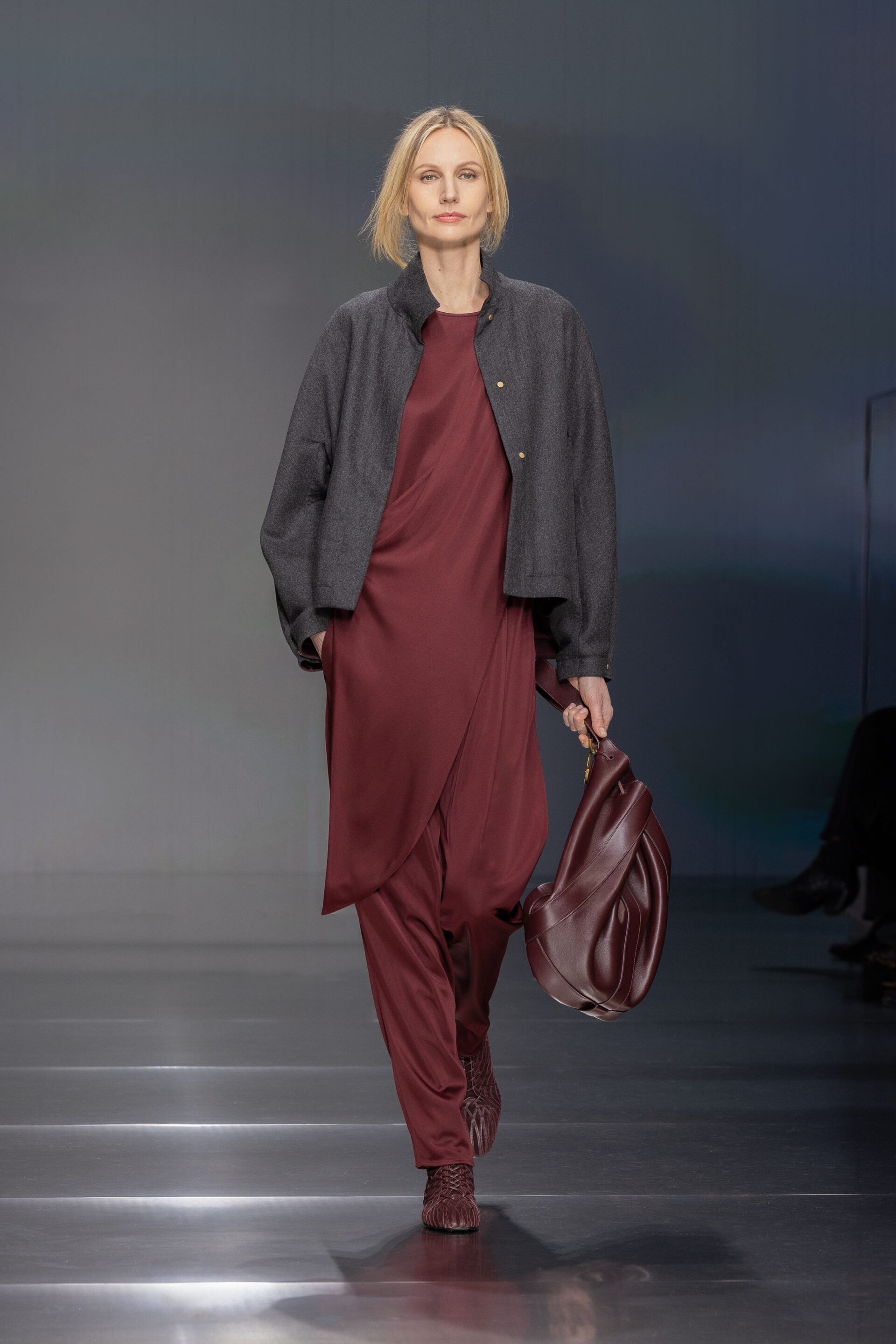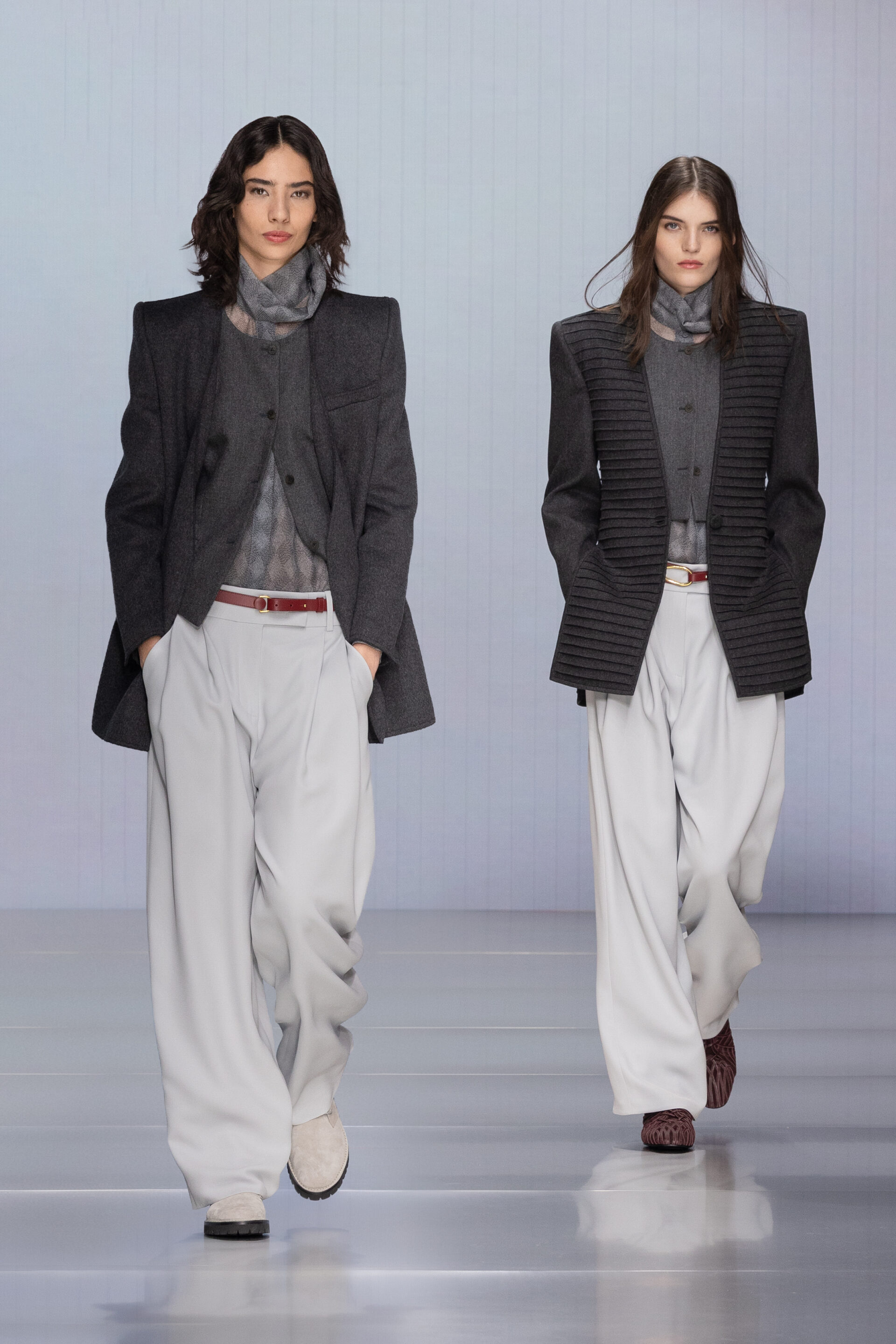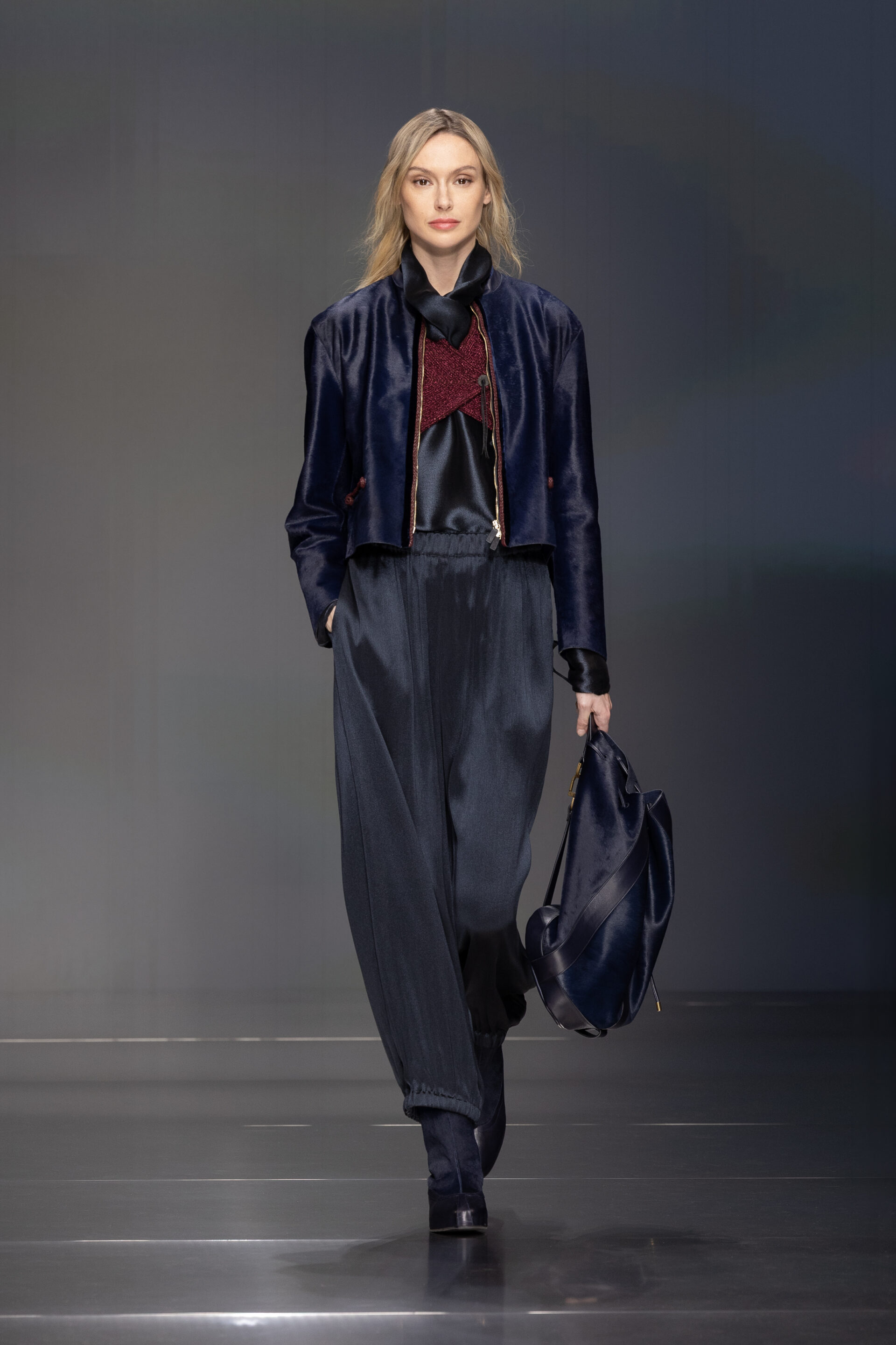 La femme Armani se renouvelle, passant du souvenir au présent avec une confiance tranquille. Le passé est perçu comme une matière vivante — à explorer et à réinventer — pour une élégance qui évolue tout en restant fidèle à son essence. La bande-son du défilé s’est conclue par le titre inédit A costo di morire, interprétée par Mina en hommage à Giorgio Armani.