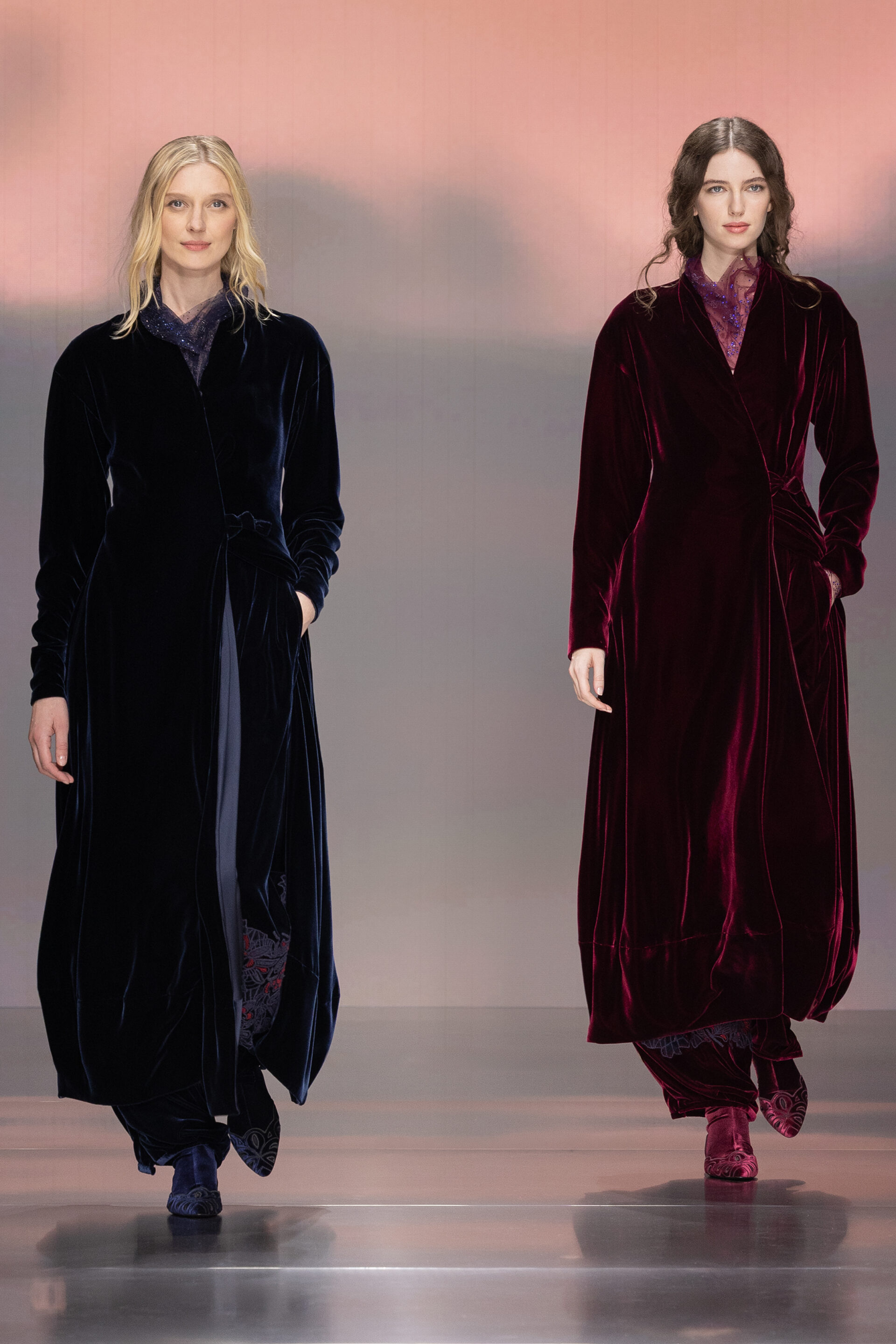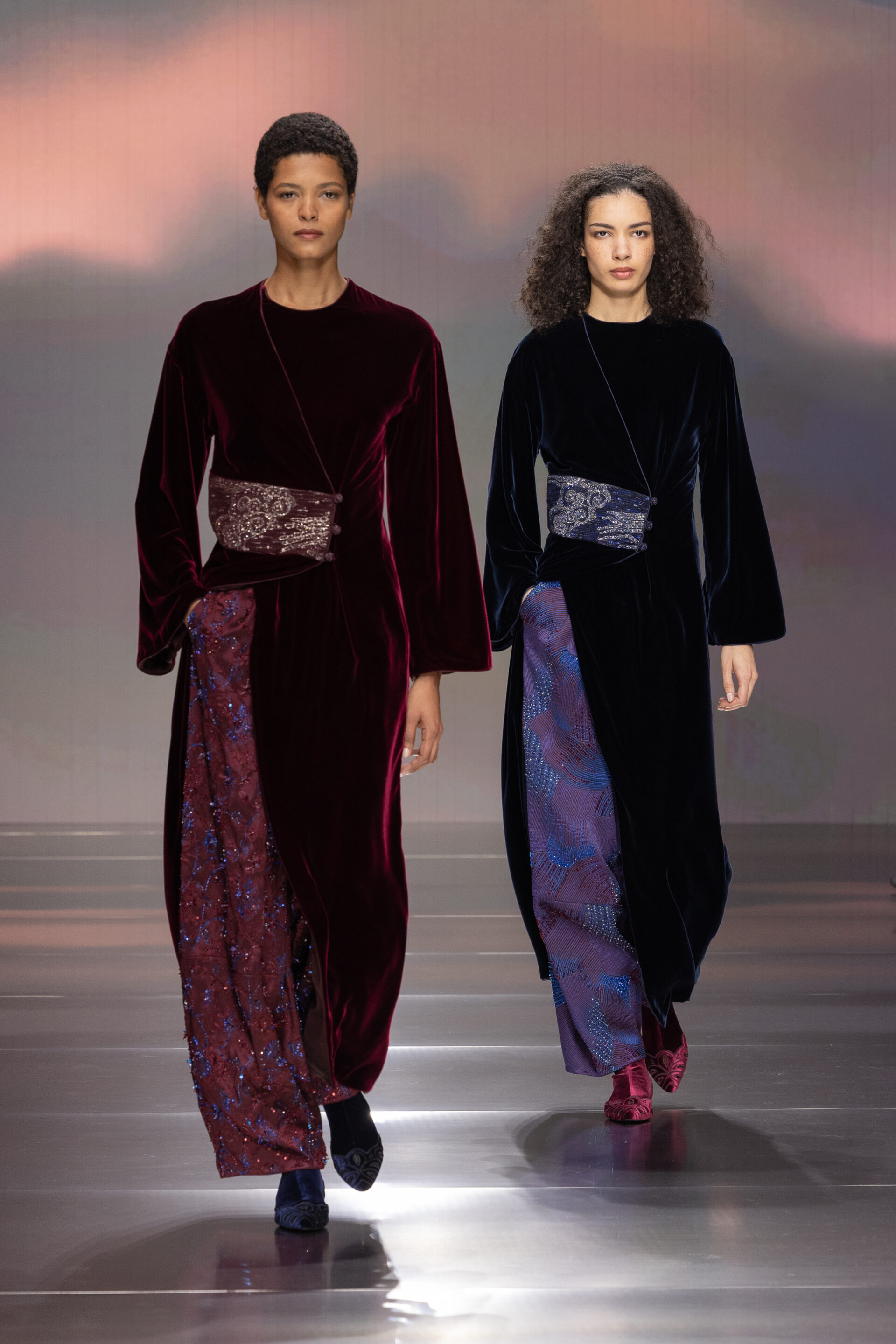 La palette s’étend autour de nuances de gris, de sauge et de bleu, illuminées par des touches de blanc qui renforcent leur pureté. Le bordeaux agit comme un fil chromatique, guidant le récit vers le soir, lorsque les vêtements deviennent si légers qu’ils deviennent des drapés de tissu léger : tuniques sur pantalons, froissées et brodées pour évoquer des sommets élevés et suggérer des paysages montagneux par un artisanat tridimensionnel et des détails précieux.