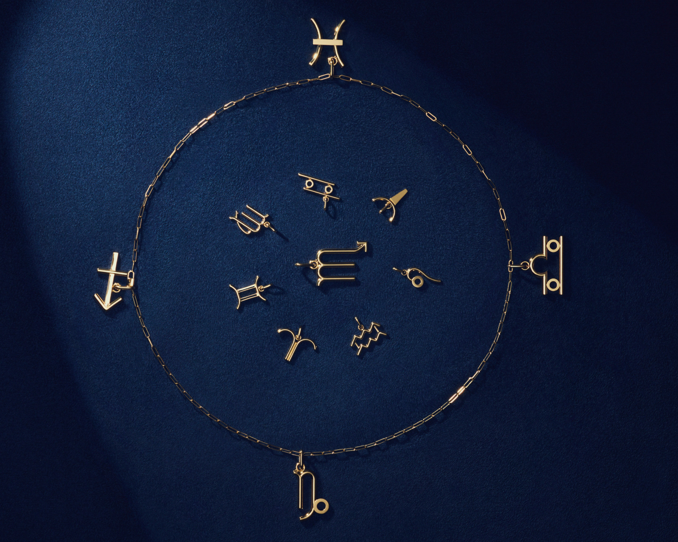 La collection se décline en trois familles, toutes centrées sur un signe du zodiaque sculpté en fil d’or :