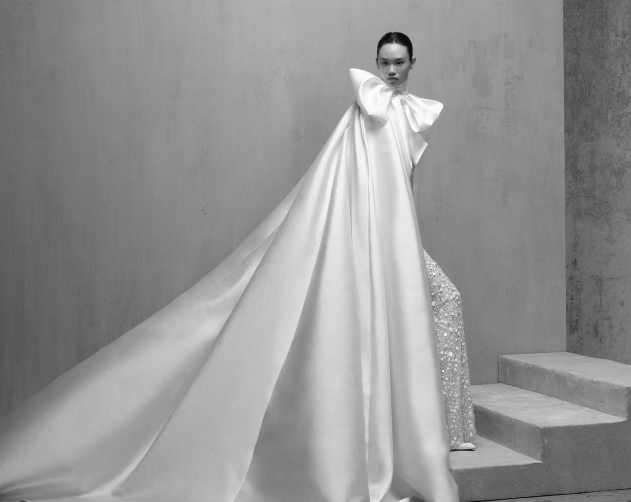 Chaque look allie douceur et force, liberté et prestance. Une robe de bal féerique adopte une aisance contemporaine avec un décolleté ballerine et de subtils galons de pierres brodées. Les lignes classiques d’une robe sirène bustier s’épanouissent de manière inattendue dans un précieux champ de perles, de paillettes et de fleurs en organza 3D. Une colonne drapée en jacquard, sculpturale au repos, devient fluide comme l’eau derrière le voile long comme un voile. Baignés d’une lumière argentée, les détails brillent en gros plan cinématographique – la courbe d’une épaule, le creux d’une taille – avant que la force de chaque silhouette ne ramène le regard vers l’ensemble rayonnant.