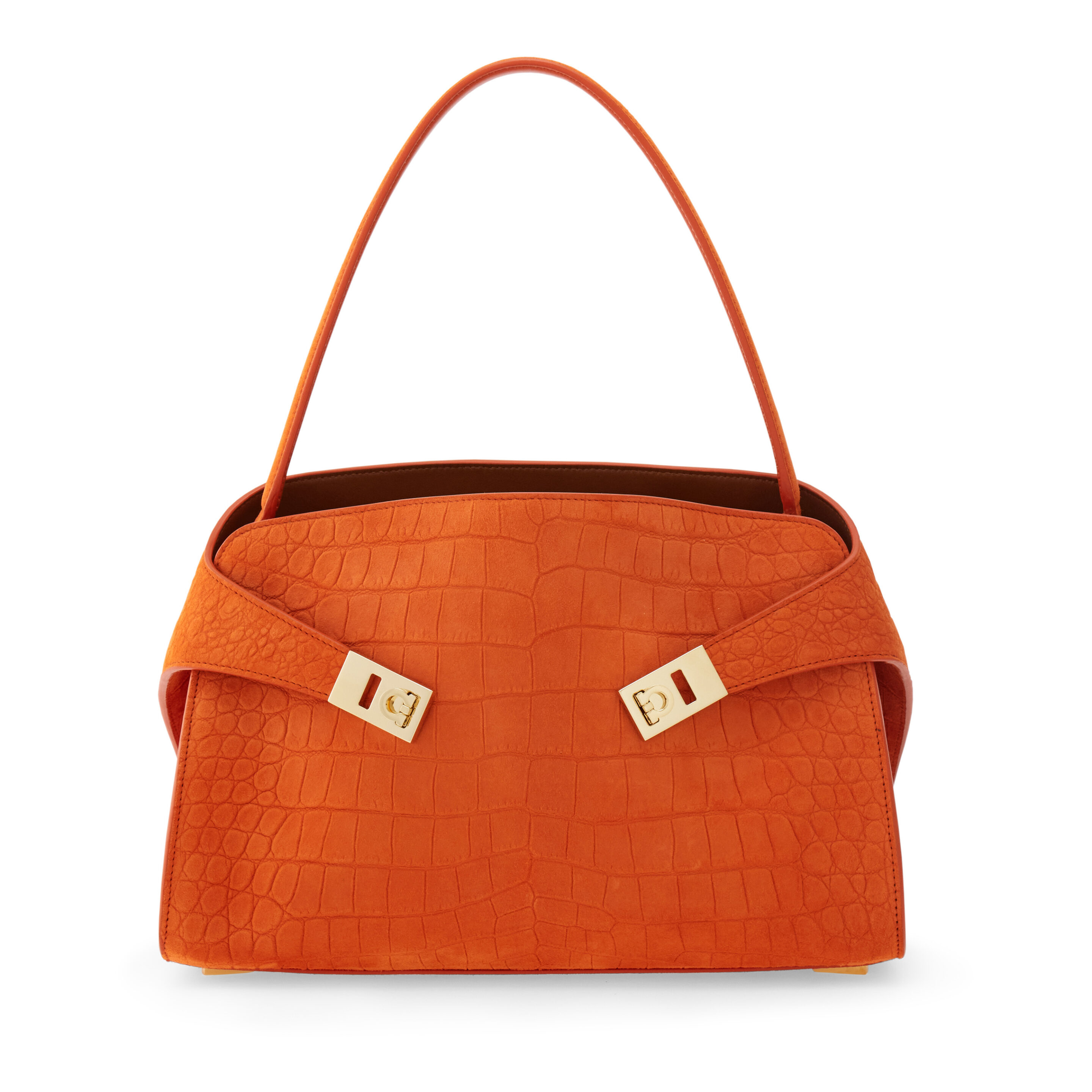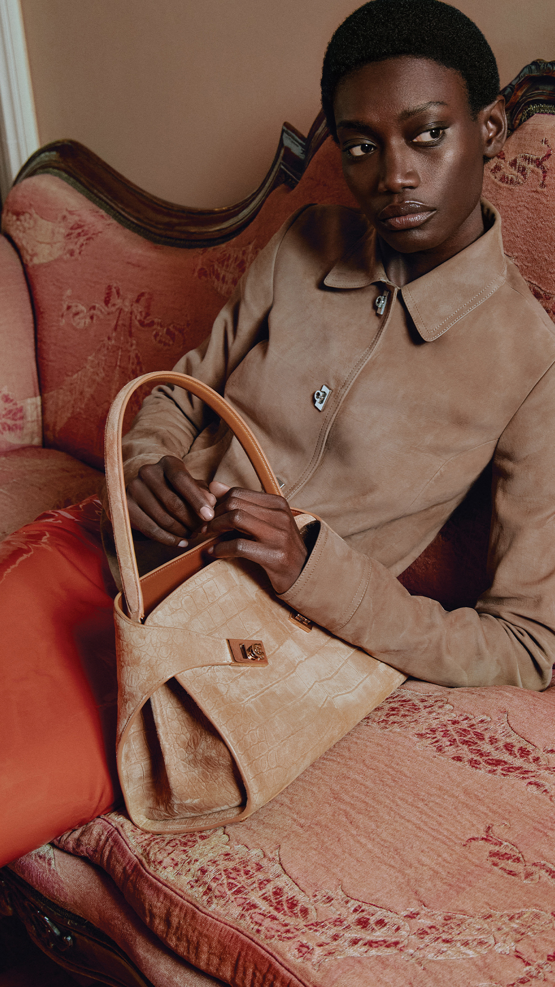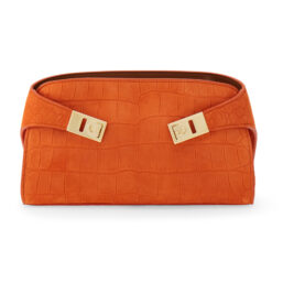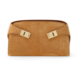 Pour le Printemps-Été 2026, la collection propose un somptueux cuir d’alligator embossé dans des tons chauds d’orange, de marron et de camel clair, ainsi qu’un cuir verni brillant noir ou orange. En daim embossé alligator, une pochette spacieuse peut également se porter en bandoulière grâce à sa bandoulière amovible.