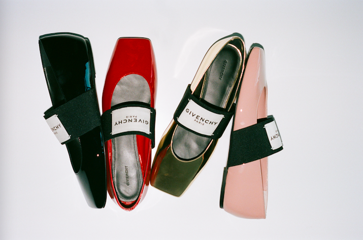 La ballerine Sliced Square est disponible en cuir specchio verni noir, rouge et poudre, ainsi qu’en cuir miroir argent et or dans les boutiques Givenchy et sur givenchy.com.