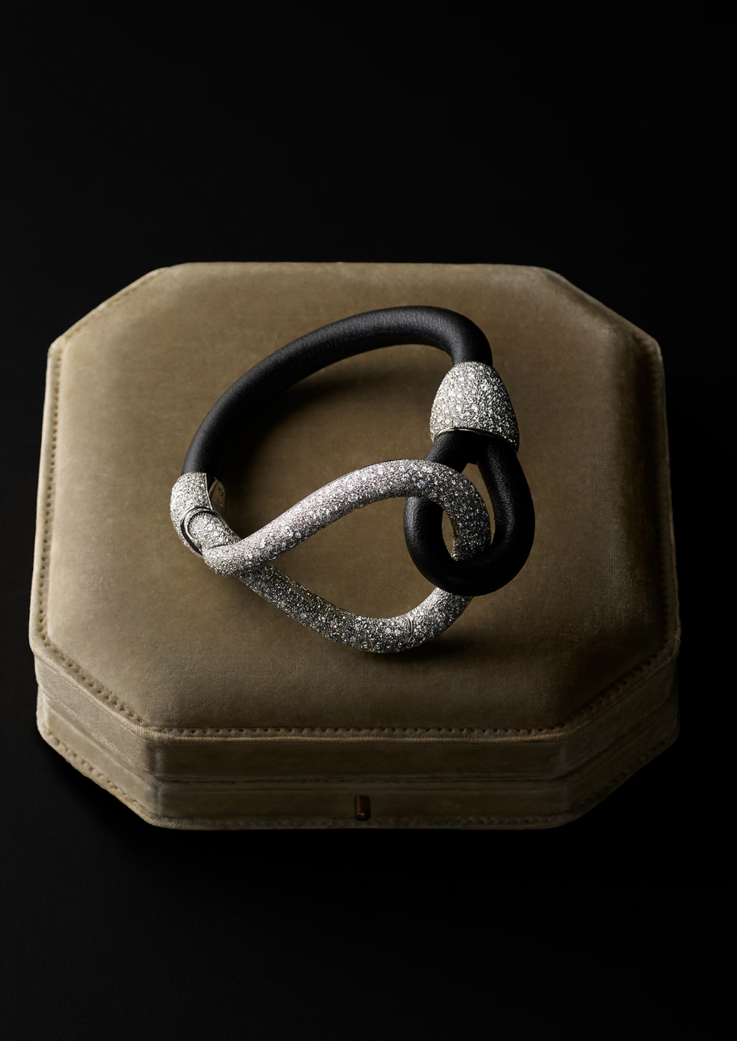 Ici, la souplesse du cuir surpiqué noir ou brun contraste donc avec l’éclat minéral des diamants et de l’or blanc pour donner vie à des bracelets sculpturaux à fermoir invisible, une pochette ultra-design ou encore une minaudière versatile dotée d’une dragonne amovible à gros maillons.