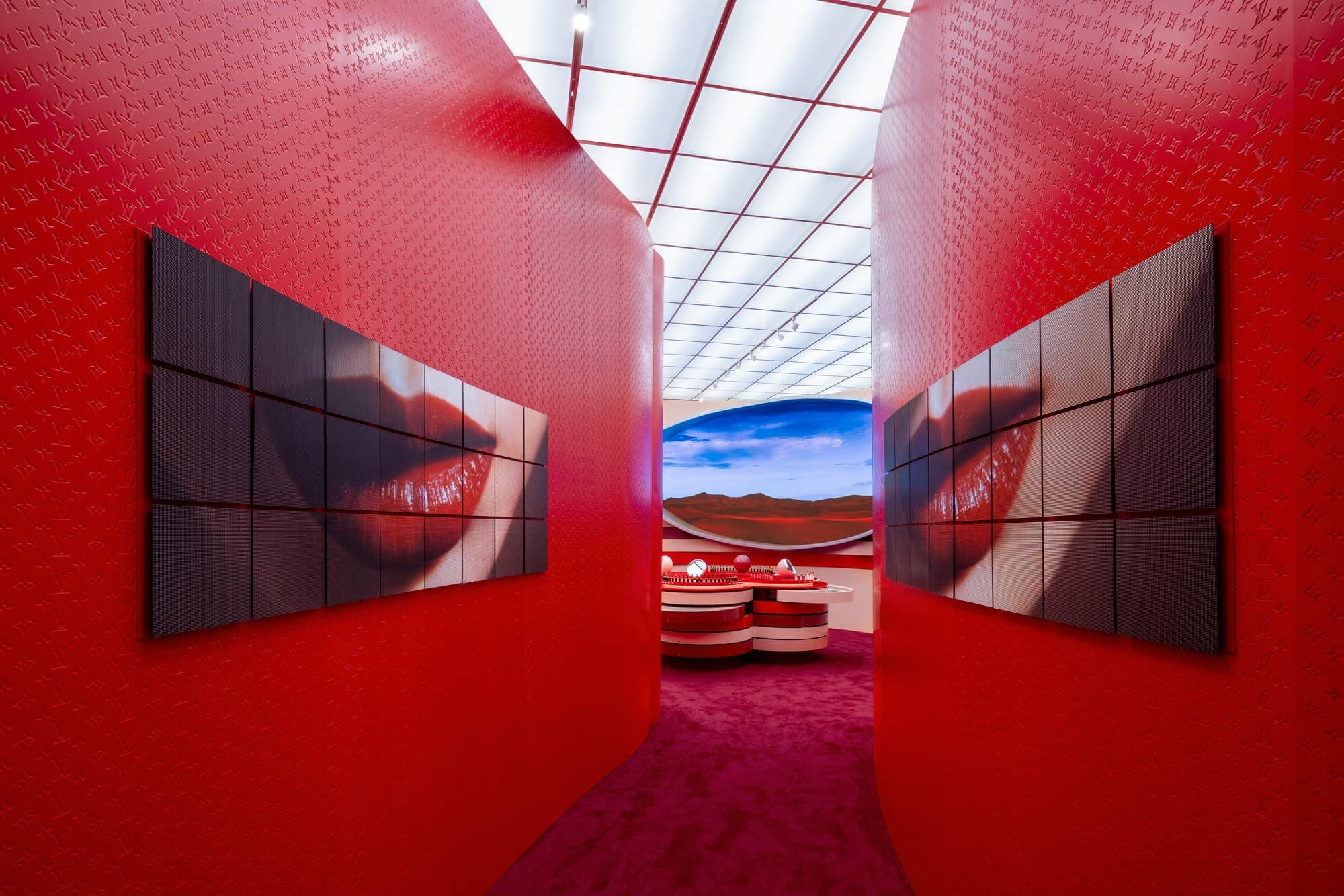 Ce pop-up est conçu comme un univers audacieux et coloré, où lignes courbes, formes organiques et étagères ondulantes aux tons rouges laqués donnent le ton. Les visiteurs entrent par un portail incurvé de 48 écrans numériques avant de découvrir une station de maquillage en forme de fleur Monogram présentant la collection complète : 55 rouges à lèvres, 10 baumes et 8 palettes.