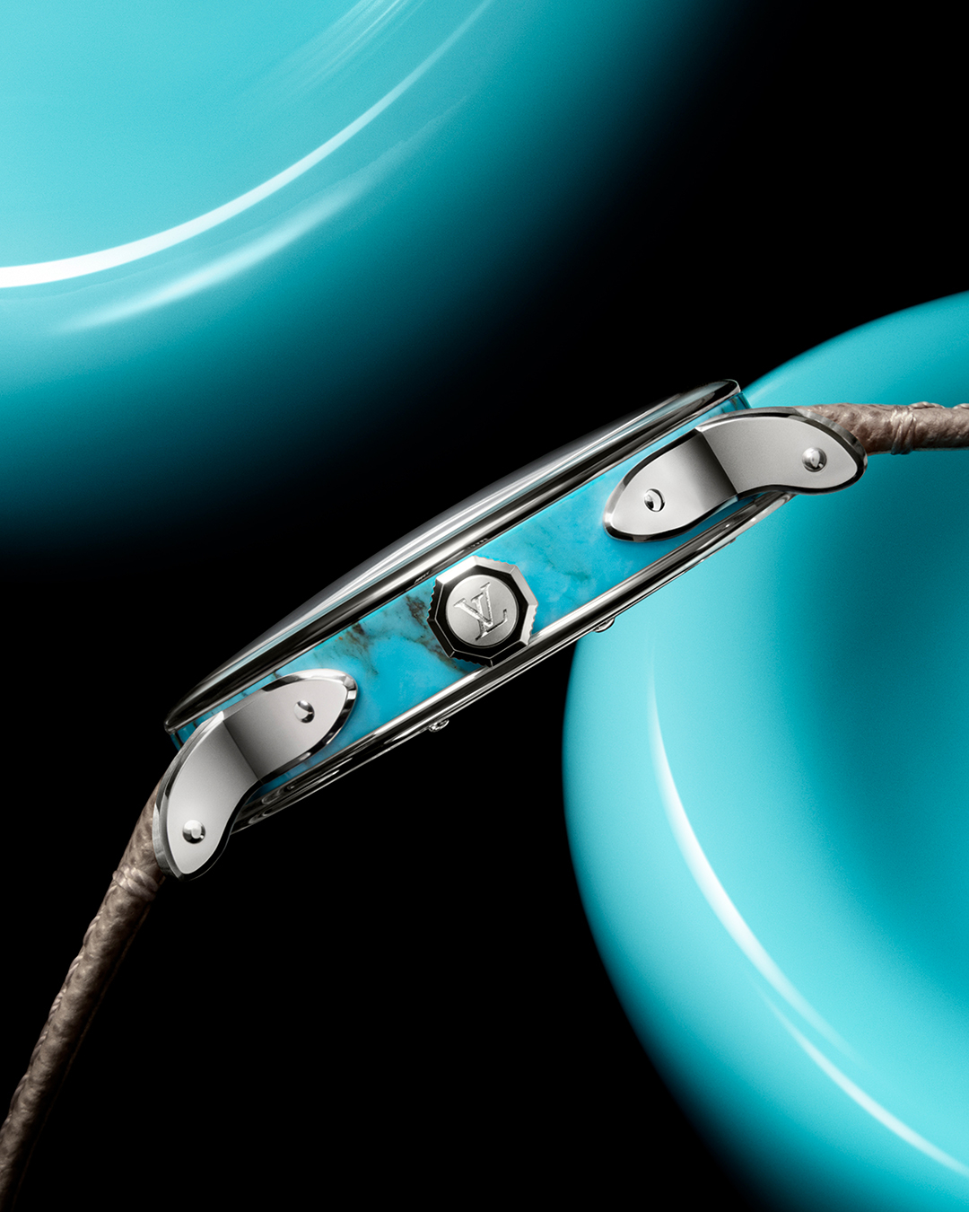 Dans une quête d’excellence et d’innovation chère à la Maison, les cadrans de ces nouveaux modèles Escale sont taillés dans la turquoise et la malachite, deux pierres prisées pour leur beauté et leurs couleurs intenses. Chaque version est limitée à 30 exemplaires. Véritable prouesse artisanale, le boîtier de 40 mm de diamètre intègre un anneau en pierre dure taillé d’un seul bloc, dans le même minéral utilisé pour le cadran. Les cornes, la lunette, le fond et la couronne sont en platine, un métal noble mettant en valeur l’éclat naturel de la turquoise et de la malachite.