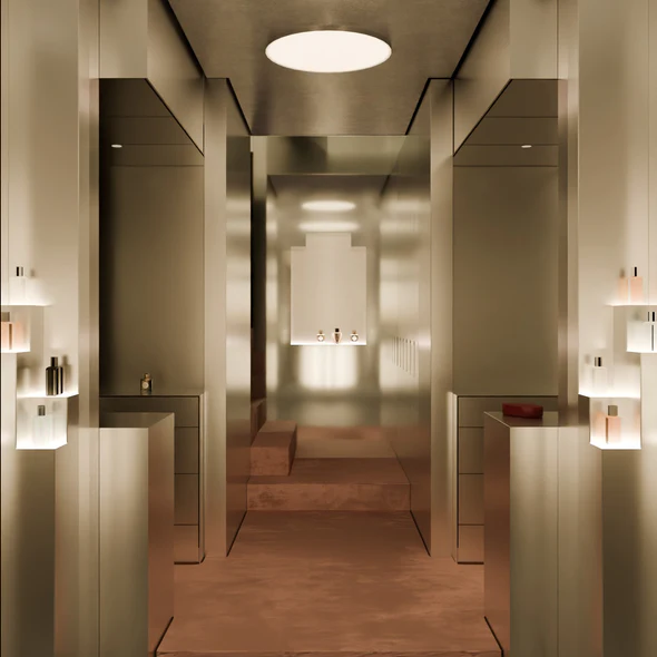 L’absence de miroirs nets participe pleinement de cette intention. Les surfaces métalliques réfléchissantes renvoient un halo. La réflexion reste diffuse, volontairement floue. « Ici, ce qui se perçoit n’est pas une image de soi, mais ce que l’on dégage. Le parfum n’a rien à voir avec le physique ou l’apparence. Ce qui compte, c’est le ressenti de l’énergie ». Ce choix recentre l’attention sur l’aura, sur ce que le parfum prolonge et révèle.