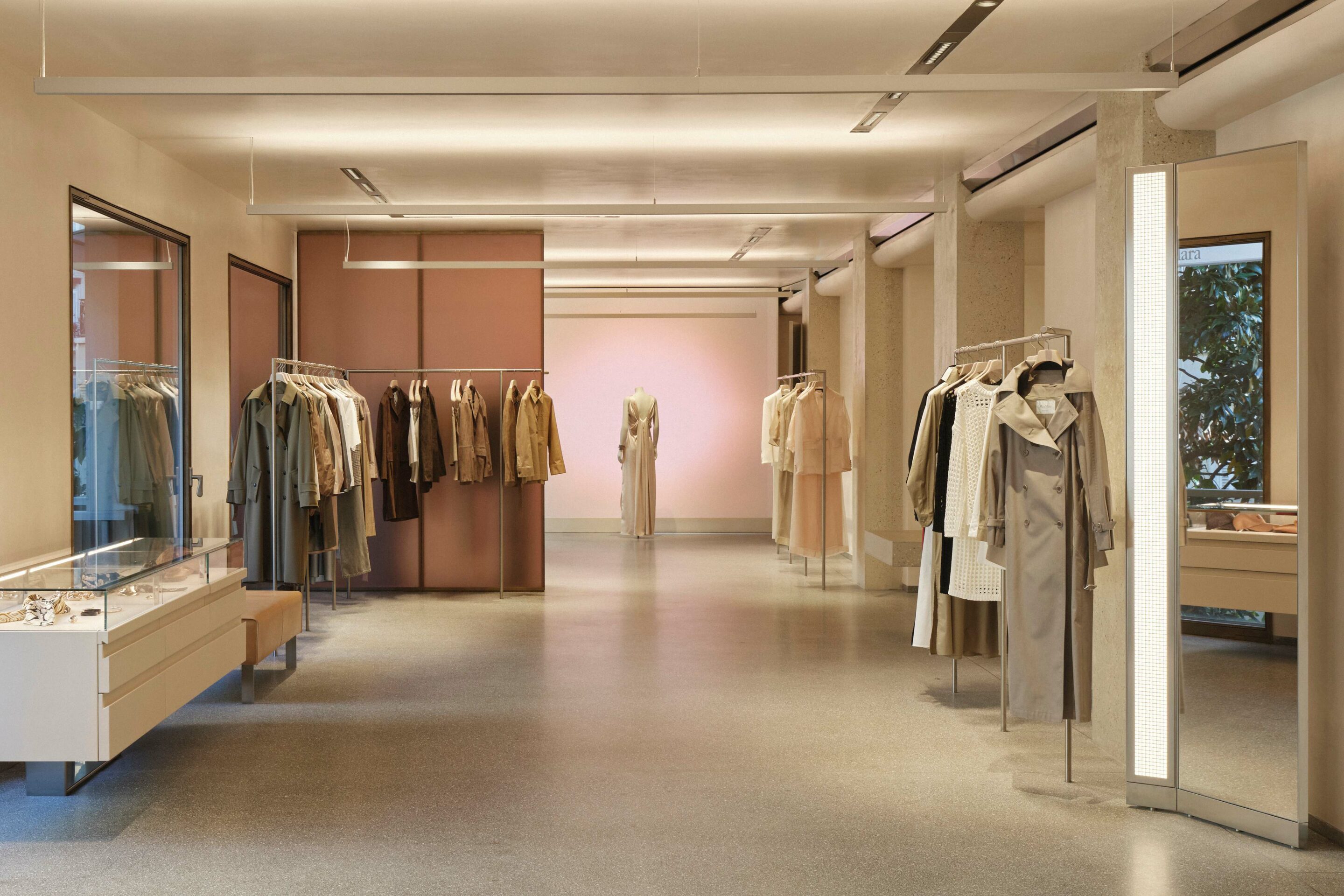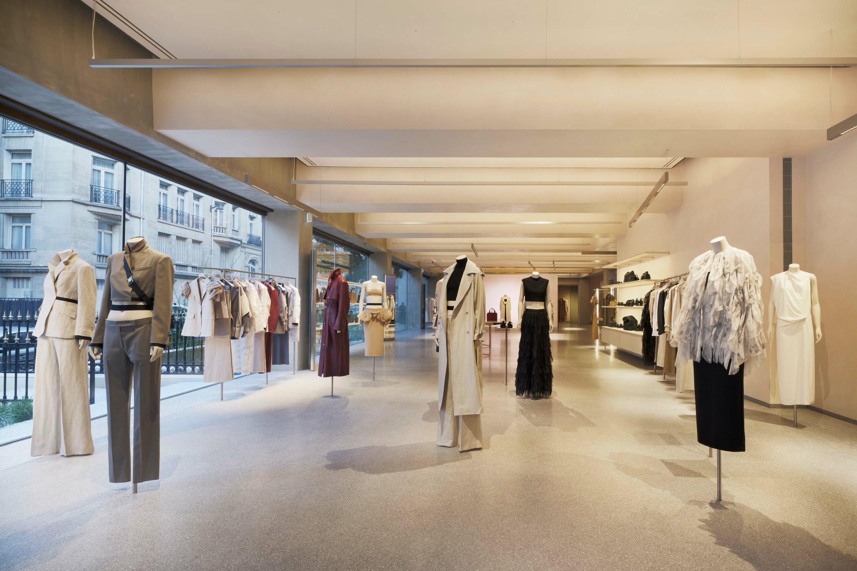 L’éclairage, réfléchi par les plafonds en marmorino, baigne l’espace d’une lumière douce, complétée par des faisceaux directionnels qui subliment les textures des vêtements. Un écran de lin rétroéclairé, dont les variations subtiles mettent en scène un mannequin phare, diffuse en