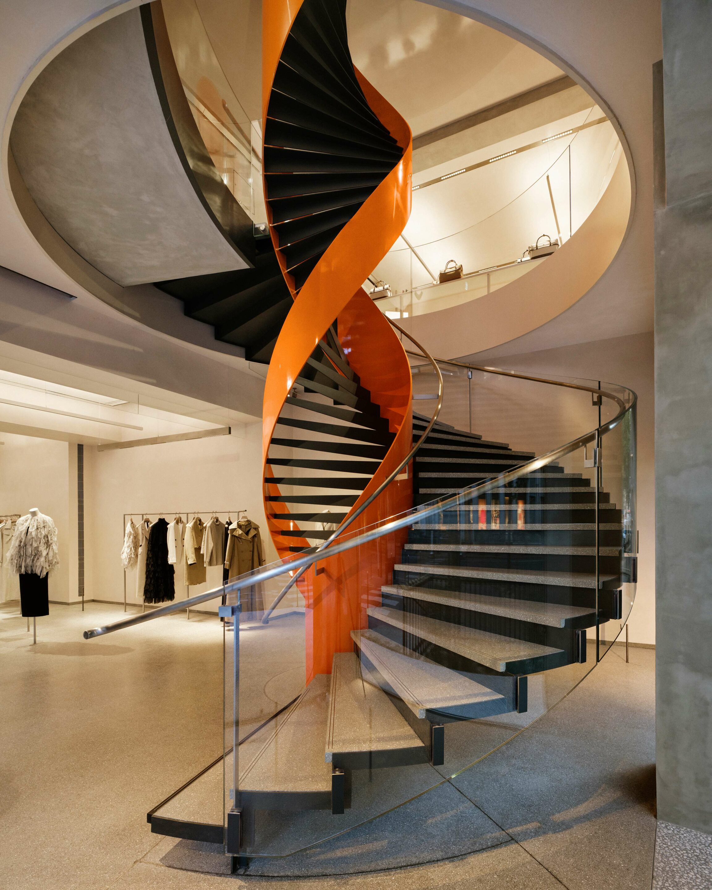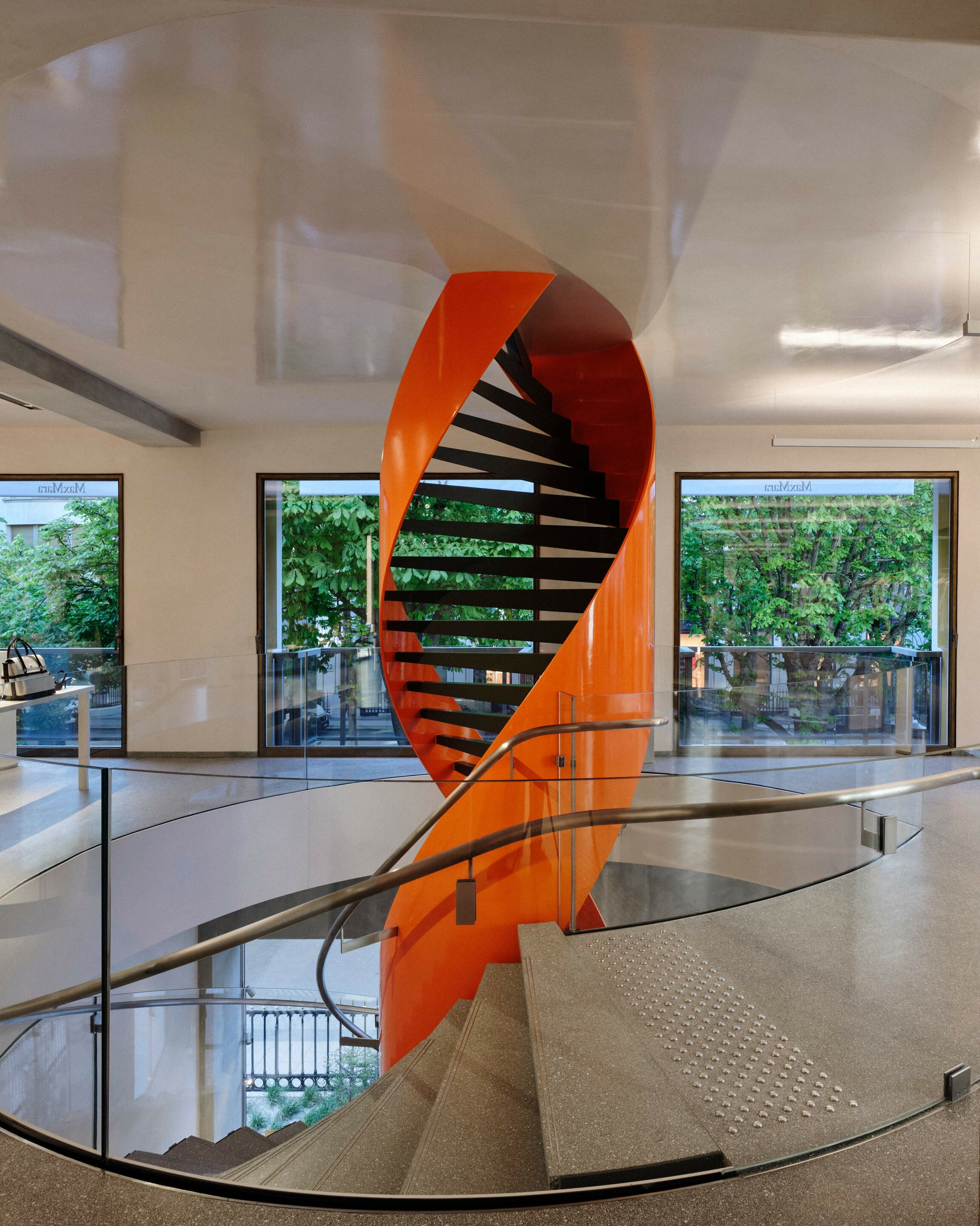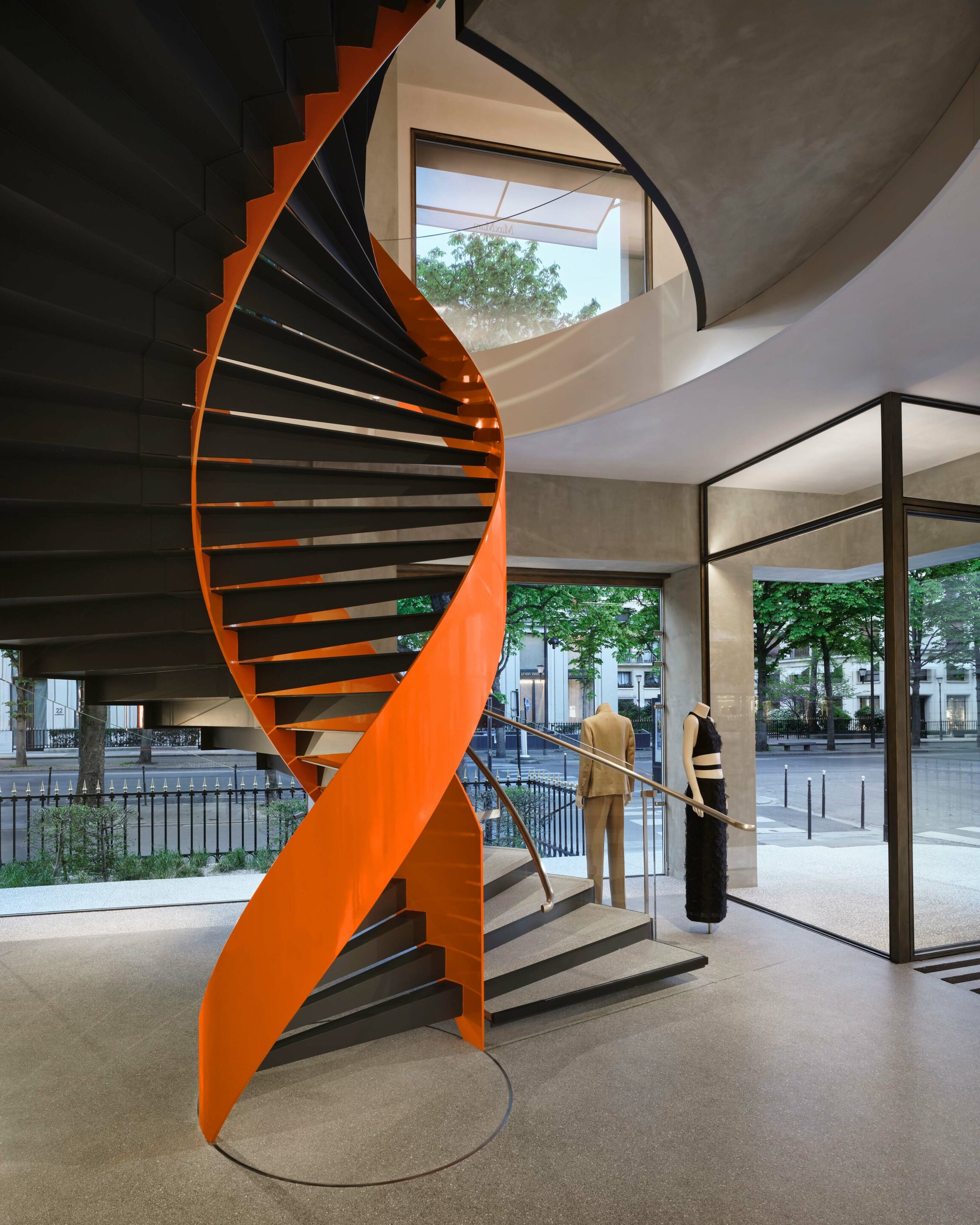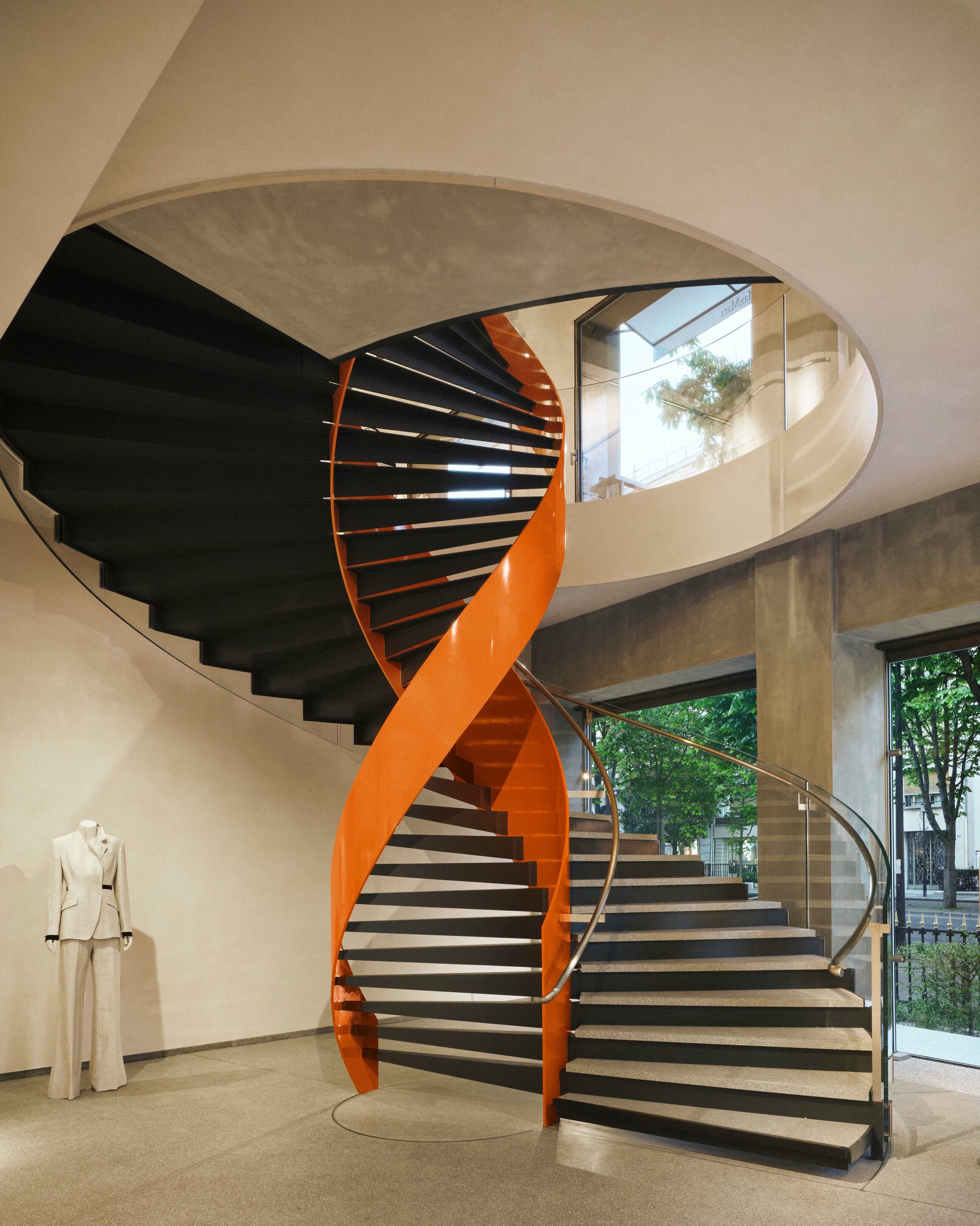 L’escalier menant au premier étage se déploie tel un double zeste d’orange. Le cahier des charges confié aux ingénieurs d’Arup était d’imaginer une structure si audacieuse et insolite qu’elle puisse être admirée depuis l’autre côté de l’avenue Montaigne.