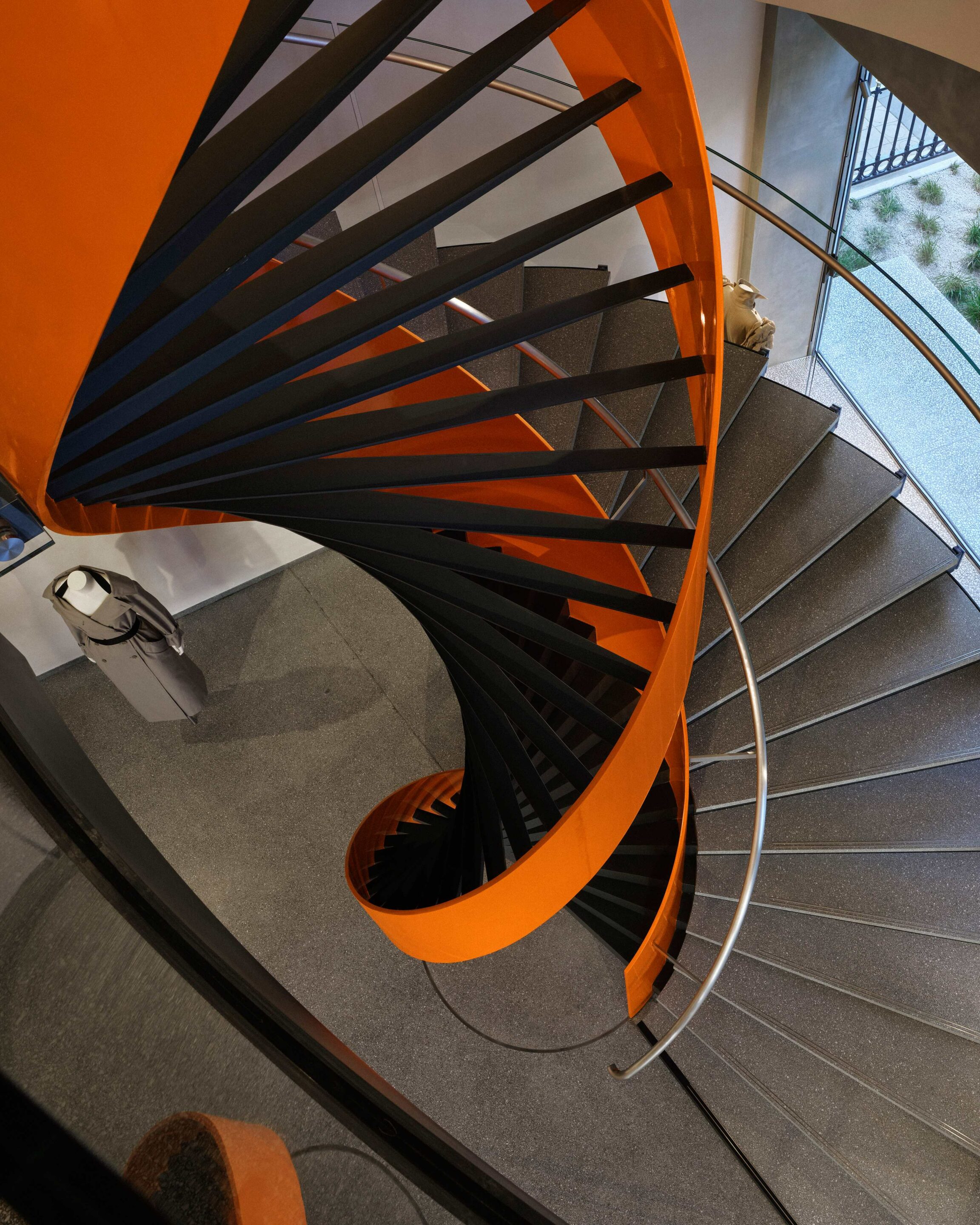 Les marches en colimaçon sont fixées en porte-à-faux sur la double hélice centrale orange. Elles sont soutenues par des flèches en acier gris qui percent les hélices, les reliant entre elles pour former un support structurel arrière. Cette hélice centrale effleure le sol en deux points seulement et s’élève jusqu’au plafond du premier étage, assurant ainsi la stabilité latérale de l’ouvrage tout en créant un lien visuel fort entre les niveaux.
