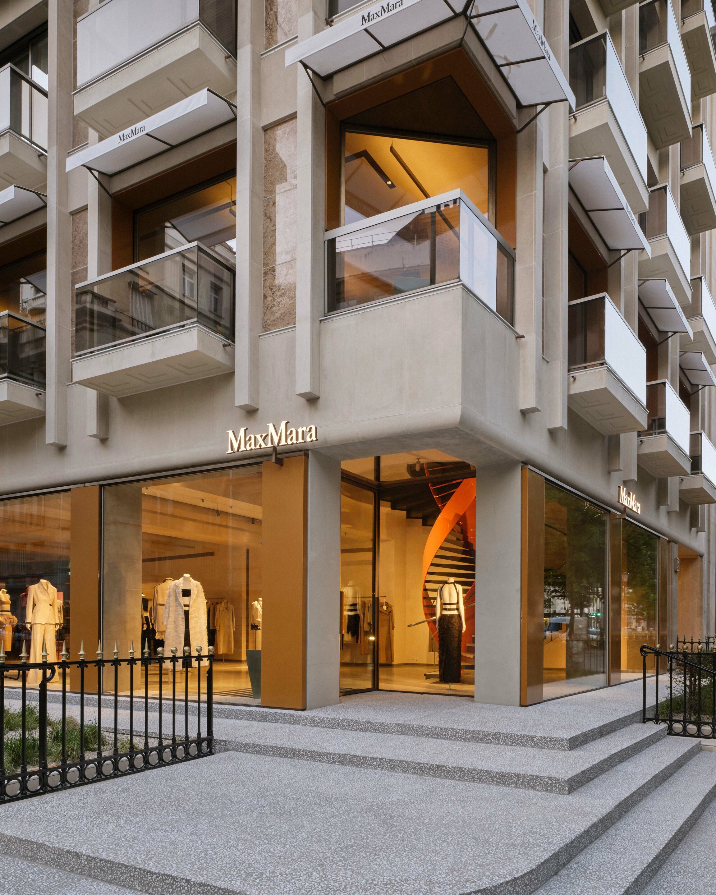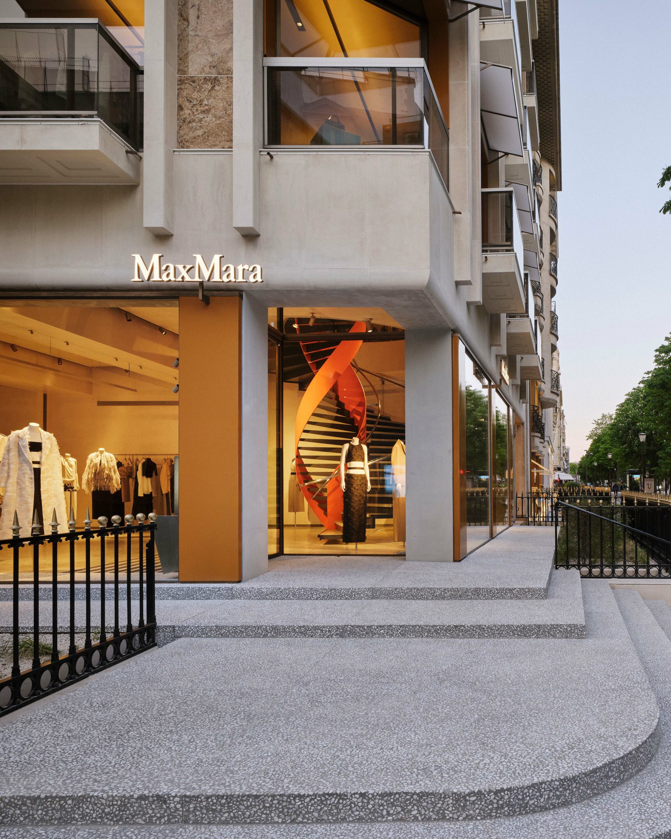 « Je veux que Paris remarque Max Mara. Mon ambition était de lancer un feu d’artifice italien, aussi éclatant qu’inattendu, sur l’avenue Montaigne », explique Sophie Hicks. « Pour moi, l’essence de Max Mara réside dans son intemporel manteau camel. Cette boutique est un jeu autour de cette nuance : une façade en émail camel, du verre teinté camel… et si l’on pousse le camel à l’excès, que devient-il? De l’orange, bien sûr ! »