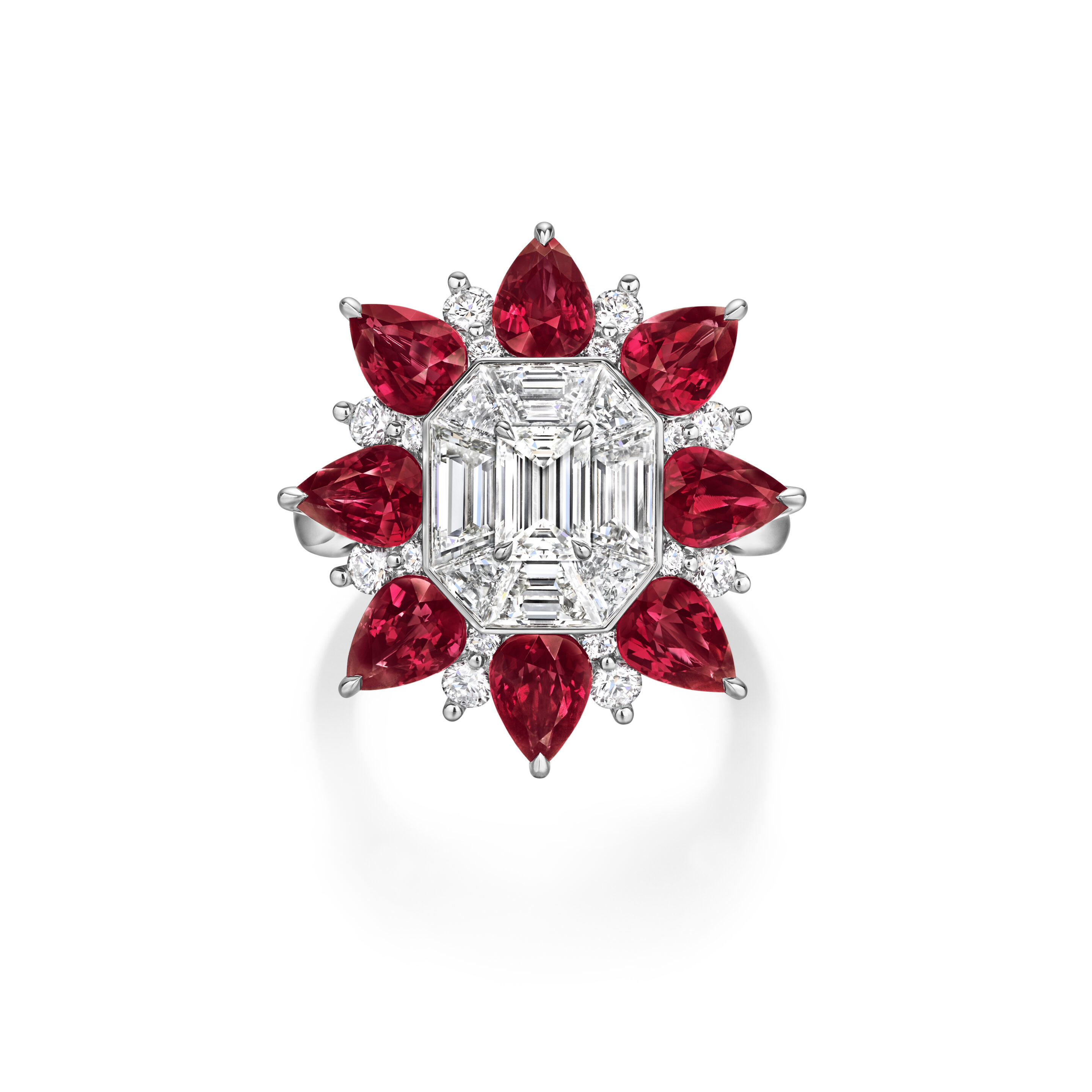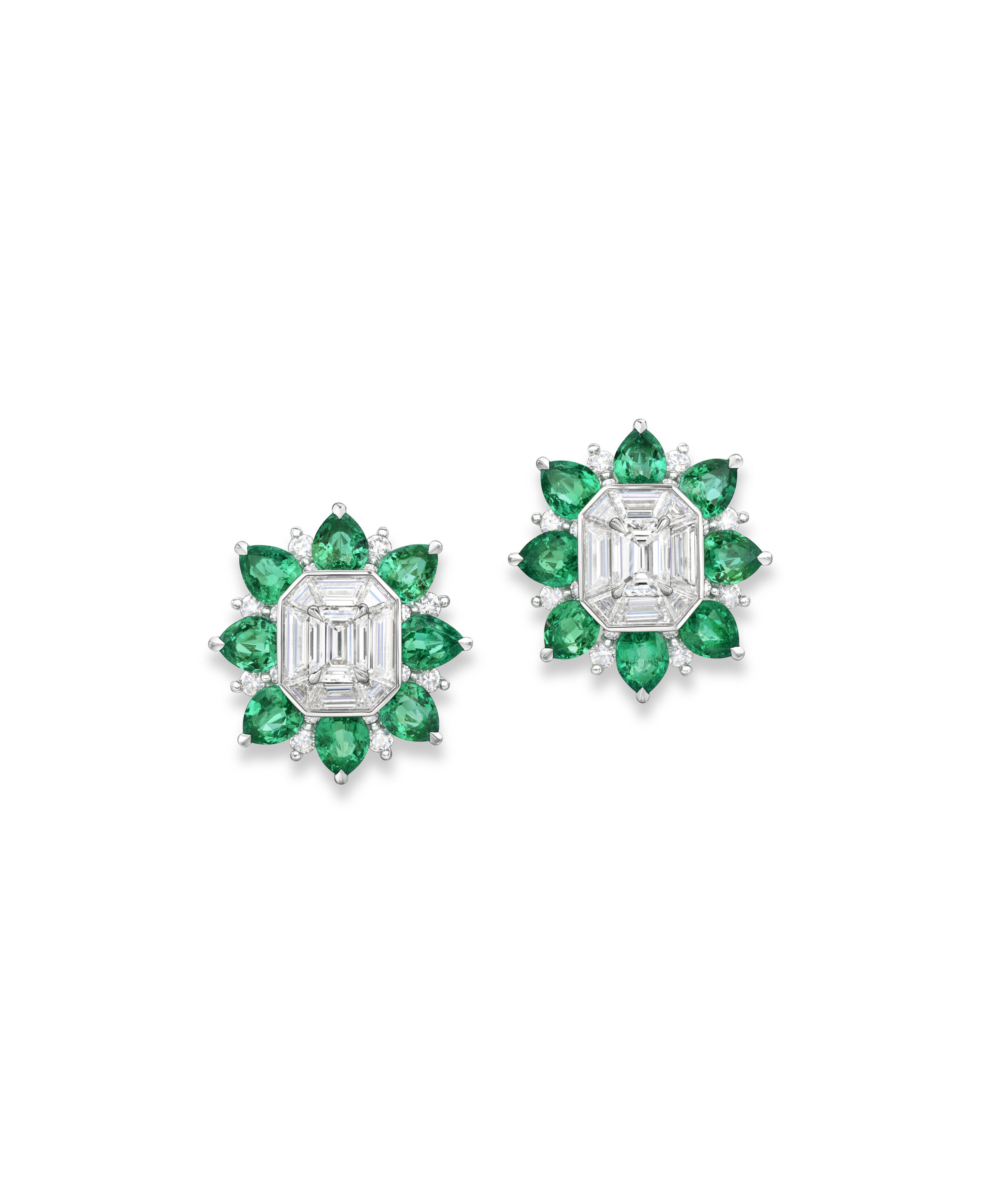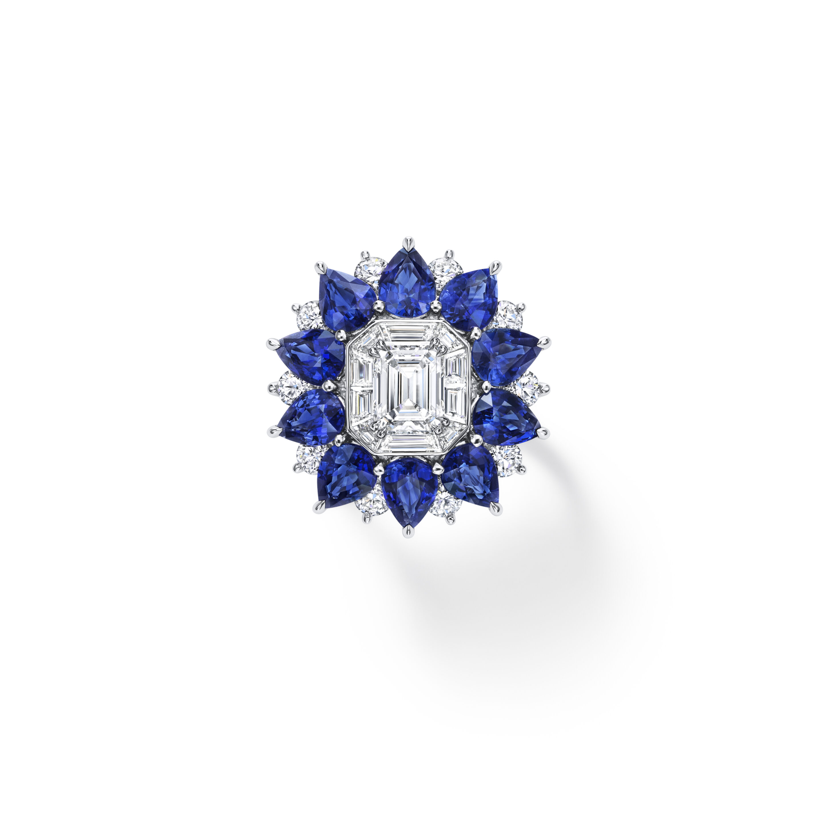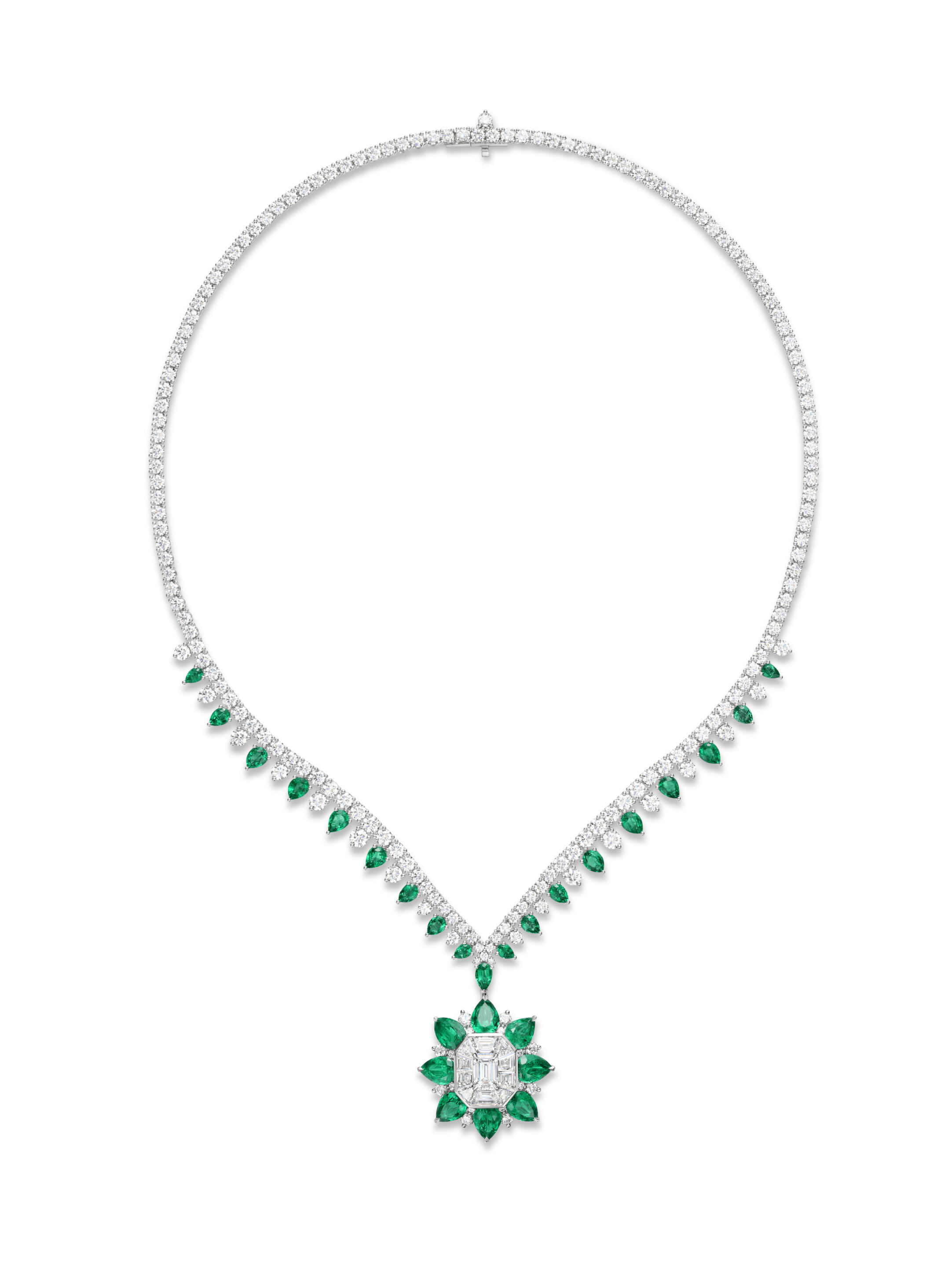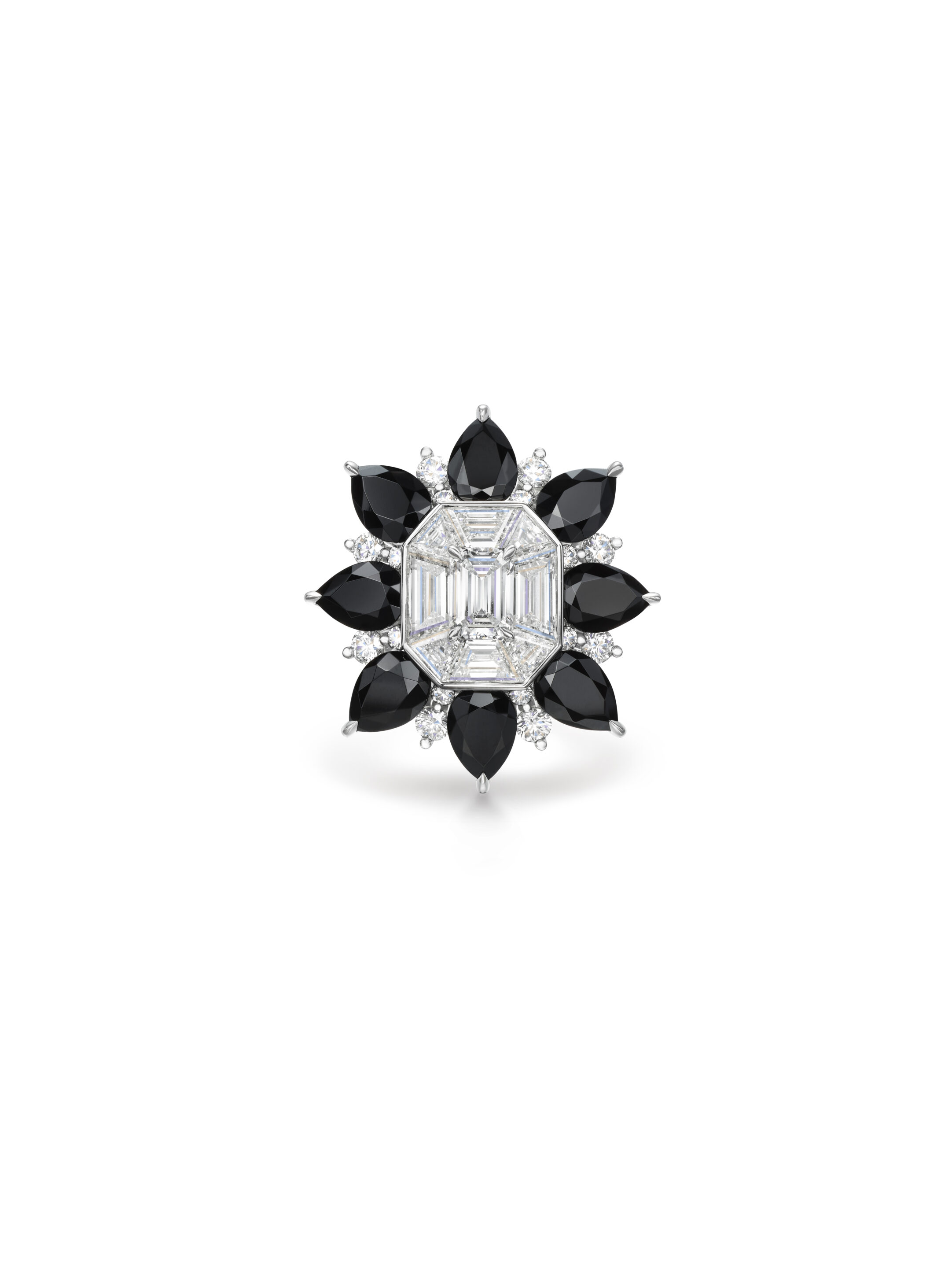 Les créations réinterprètent la précision et les contrastes des motifs en marbre noir et blanc de la boutique avec une opulence toute géométrique. Un collier, une paire de boucles d’oreilles et une bague composent une parure articulée autour d’un motif de 10 pierres précieuses taille poire encerclant un diamant taille émeraude : lumière et couleur convergent pour donner vie à une expertise remarquable.