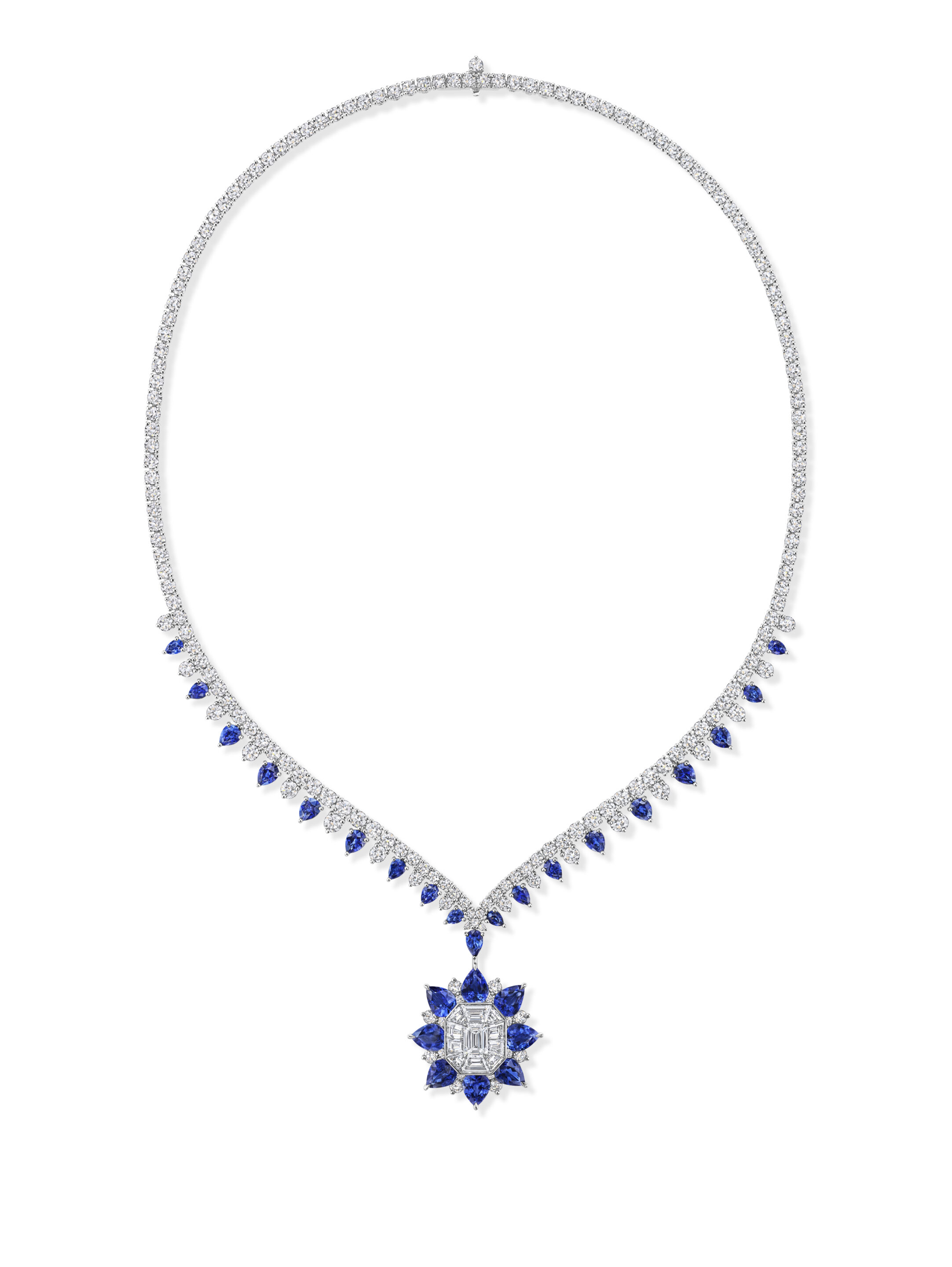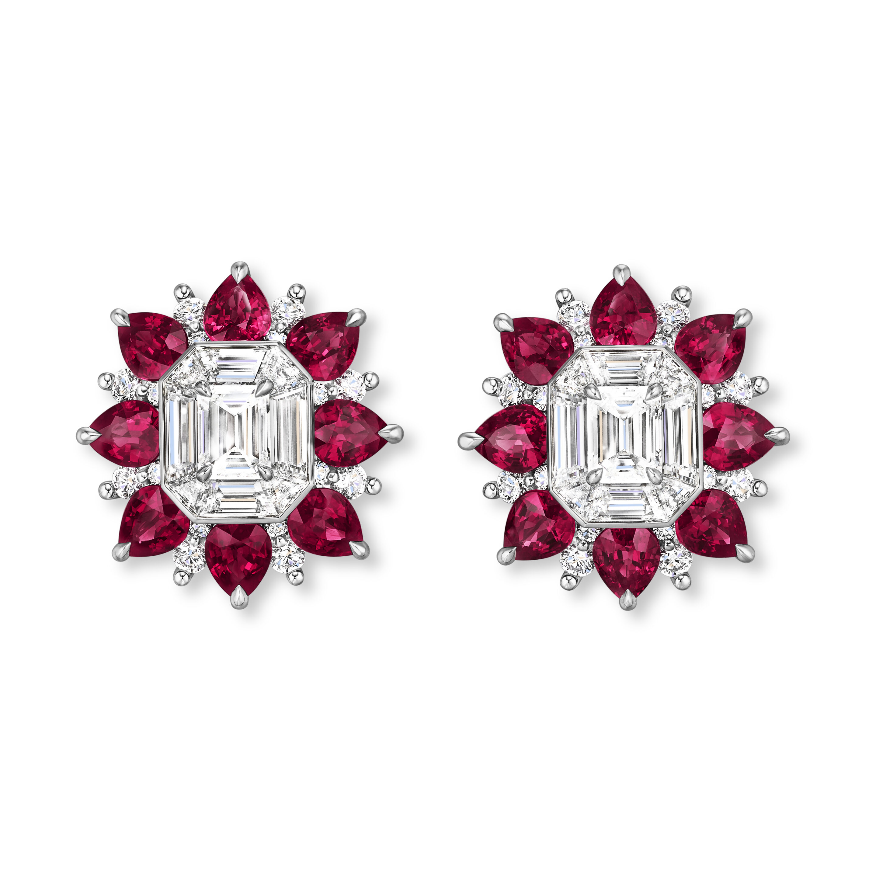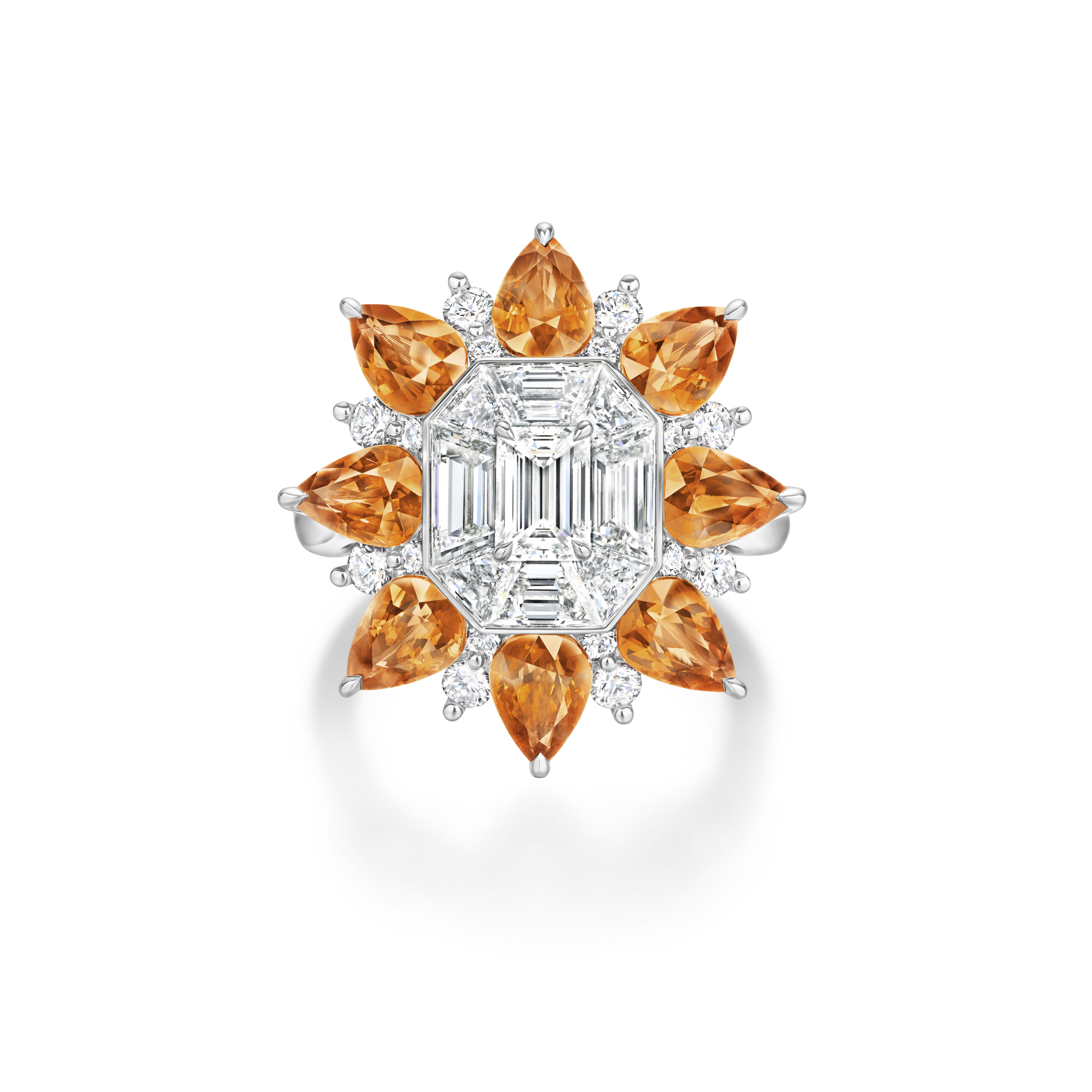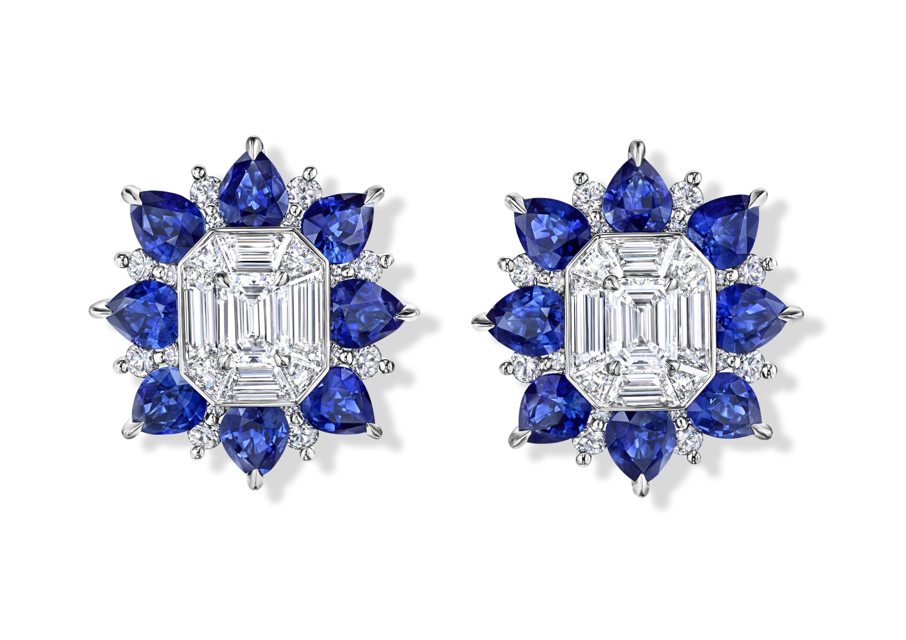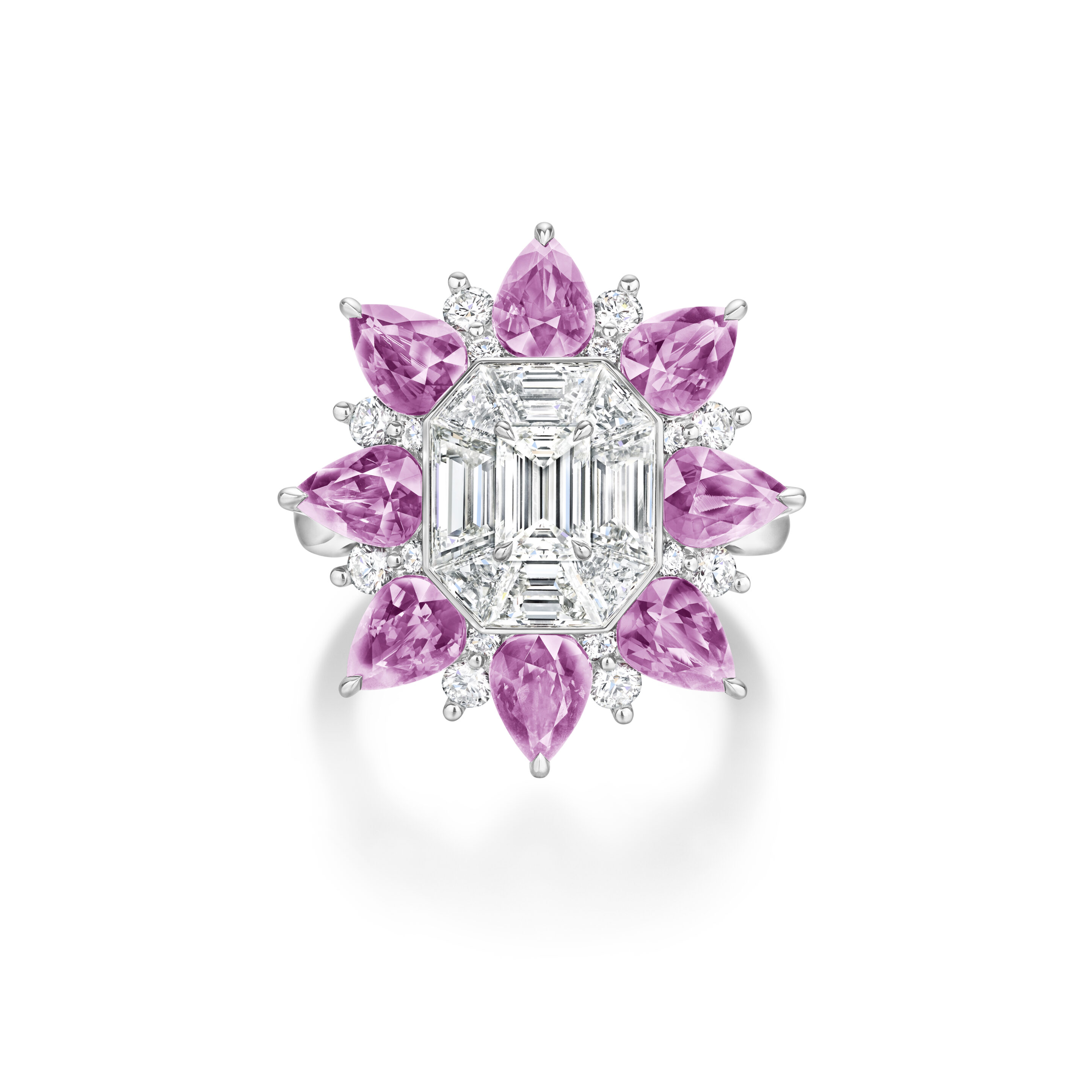 Les créations réinterprètent la précision et les contrastes des motifs en marbre noir et blanc de la boutique avec une opulence toute géométrique. Un collier, une paire de boucles d’oreilles et une bague composent une parure articulée autour d’un motif de 10 pierres précieuses taille poire encerclant un diamant taille émeraude : lumière et couleur convergent pour donner vie à une expertise remarquable.