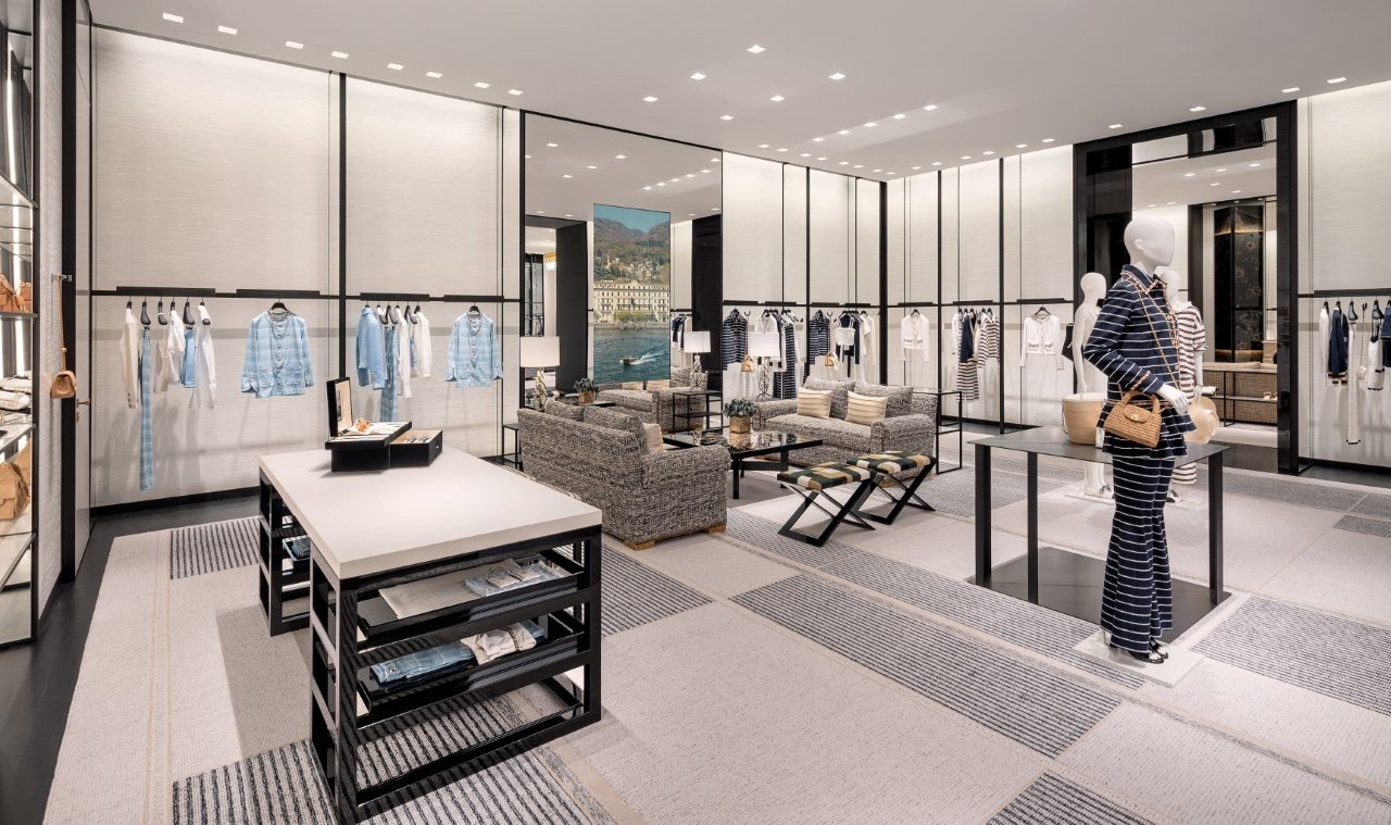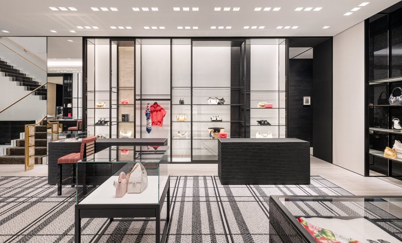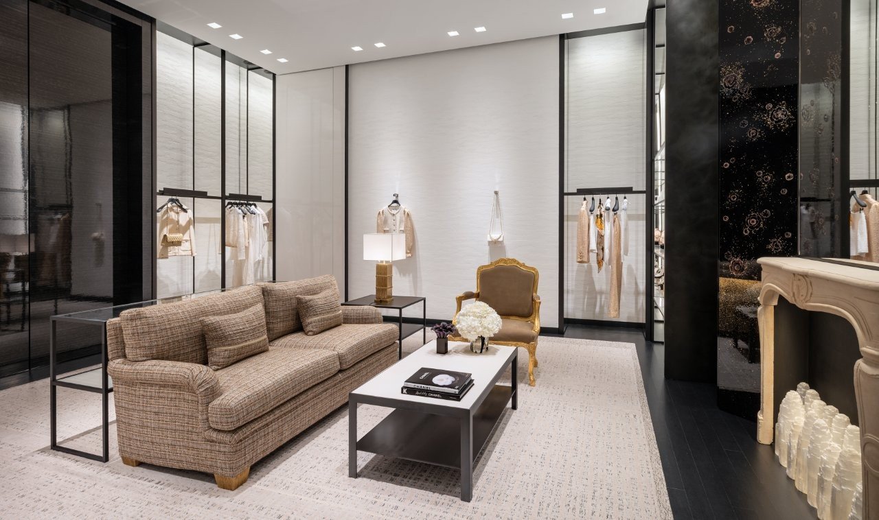 Dès l’entrée, une impressionnante façade à double hauteur accueille les visiteurs, et un grand escalier aux textures contrastées de pierre de lave noire et de marbre blanc lumineux mène à un nouvel étage supérieur. L’étage supérieur, baigné d’une douce lumière, abrite de vastes salons dédiés au prêt-à-porter et aux chaussures, ainsi qu’un tout nouveau salon VIP privé. Les pièces sont éclairées par deux lustres Goossens en bronze doré et cristal de roche et présentent une cheminée ancienne en calcaire datant de l’époque Louis XV. Au rez-de-chaussée, les clients sont accueillis dans trois spacieux salons d’accessoires, présentant les dernières collections de prêt-à-porter de la saison, ainsi que des sacs, des lunettes de soleil, de la petite maroquinerie et des bijoux fantaisie.