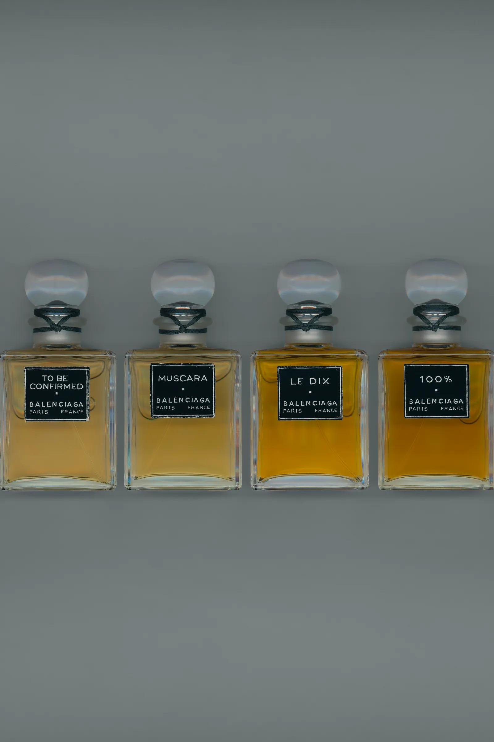 Il faut d’abord parler de ce qui saute aux yeux en premier : l’aspect vintage des flacons, exactes reproductions du tout premier parfum de la maison. 15 années de recherches ont permis aux archivistes de dénicher cette rareté, imaginée par Cristòbal Balenciaga en 1947. Son nom ? Le Dix, référence à l’adresse historique du salon de couture au 10 Avenue George V – dont on reparlera plus tard. Les experts ont passé cet écrin au crible, l’ont scanné pour pouvoir le reproduire à l’identique, dans les moindres détails. Le flacon, qui semble d’époque, a ensuite été glissé dans une boîte aux coins usés et à l’aspect terni, comme si elle avait traversé les décennies. Le résultat est saisissant : on croirait avoir entre les mains un ancien flacon, retrouvé dans une coiffeuse d’époque… En contraste, le tout est inséré dans le packaging gris industriel emblématique de Balenciaga. Idée de génie.