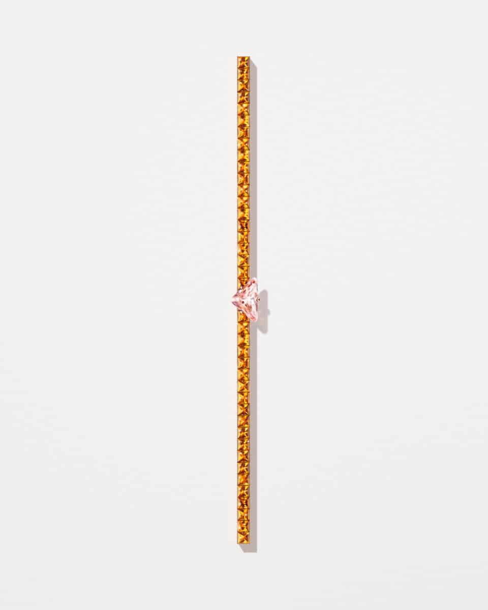 Prada dévoile à cette occasion une coupe brevetée — la “taille Prada” — qui sculpte la pierre en un volume triangulaire net, tendu, presque brutaliste, et qui sert de fil directeur à l’ensemble de la collection. L’exercice n’a rien d’esthétique seulement : trouver des pierres suffisamment grandes, suffisamment pures et suffisamment stables pour supporter une telle taille a nécessité près de 18 mois de collaboration avec des prospecteurs internationaux.