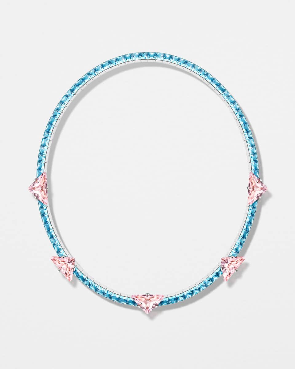 Les montures, en or blanc 18 carats, sont volontairement minimalistes, presque silencieuses, comme si la pièce devait s’effacer au profit de la pierre. Les assemblages chromatiques sont à la fois audacieux et sophistiqués. Prada joue les contrastes : le bleu dense contre le rose glacé, le vert citron face au blanc diamant.