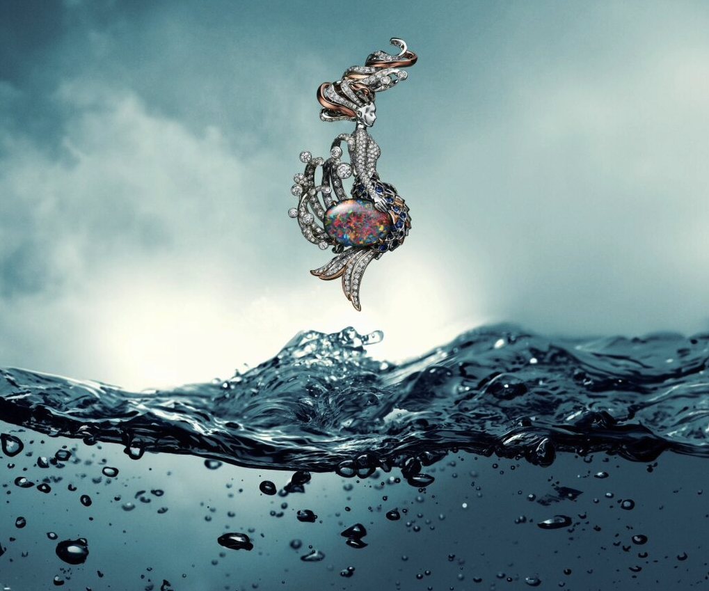 Séduit par la figure mythique de la sirène, ce chapitre explore son charme à travers le regard imaginatif de Nathalie Verdeille. Une broche en platine, or rose et diamants représente une sirène en mouvement, sublimée par une opale noire de plus de 10 carats au niveau de sa nageoire. Le motif se poursuit dans Une bague, des boucles d’oreilles et un collier expressifs, chaque pièce rendant hommage à un monde sous-marin fantastique.