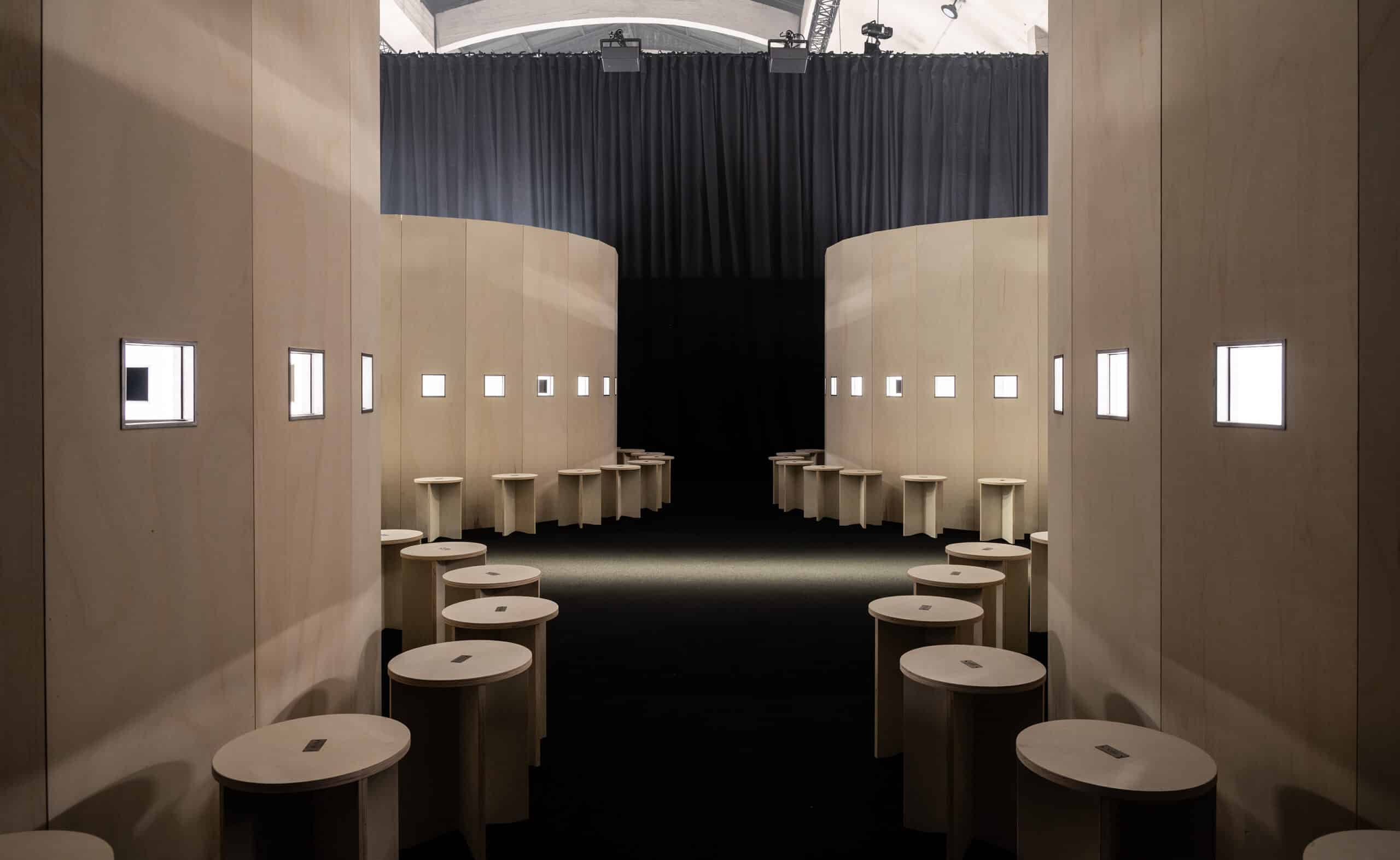 Dans le contexte du défilé Specula Mundi, le Kaiserpanorama prend la forme d’un autel contemporain : un lieu de concentration sym- bolique qui institue une ritualité, oriente le regard et en règle l’accès. Ce qui y apparaît est séparé de l’usage commun, isolé, mis en évidence, rendu digne de contemplation. Les cloches qui, historique- ment, dans le Kaiserpanorama, marquaient le passage d’une image à l’autre se font ici musique techno, se transformant en pulsations litur- giques qui scandent le temps de l’apparition. Et ce n’est pas un hasard si les robes émergent comme des épiphanies empreintes de divinité : des présences archaïques quoique profondément actuelles qui af- fleurent d’une fouille archéologique dans l’imaginaire hollywoodien.